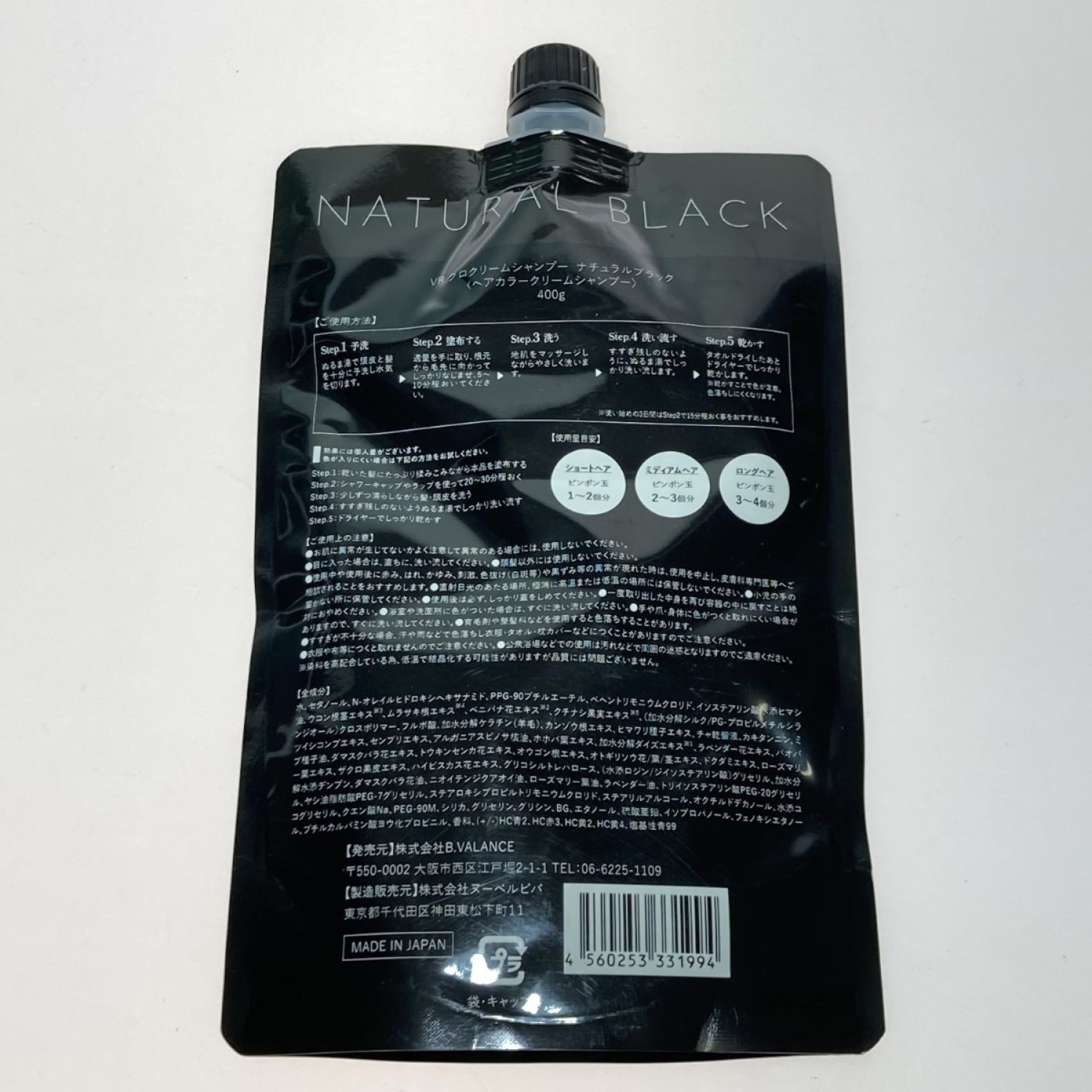 VALANROSE バランローズ KURO クリームシャンプー ナチュラルブラック 400g 白髪染め