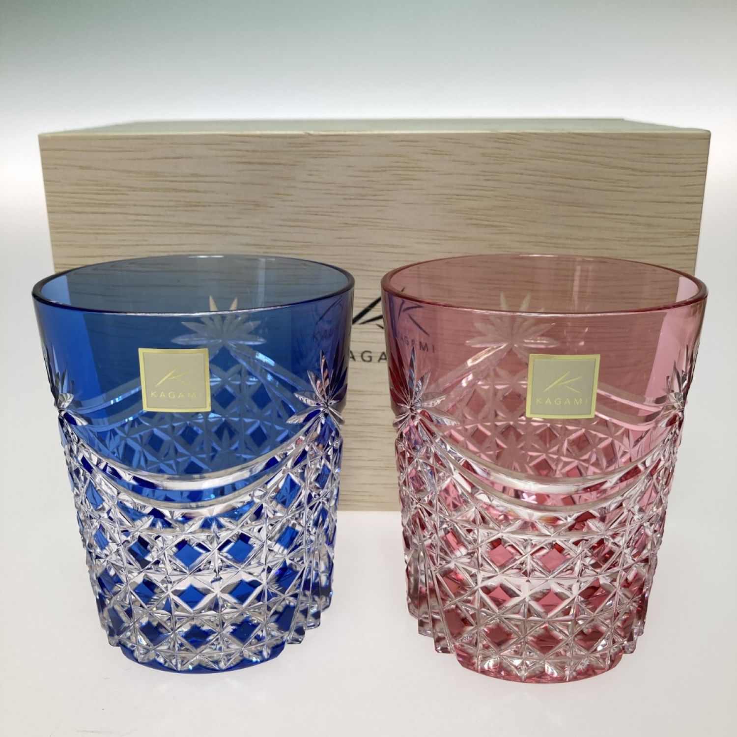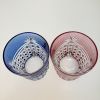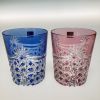 【商品名】中古 カガミクリスタル 江戸切子 ペアロックグラス<幕襞に四角籠目> 赤 x 青 Sランク