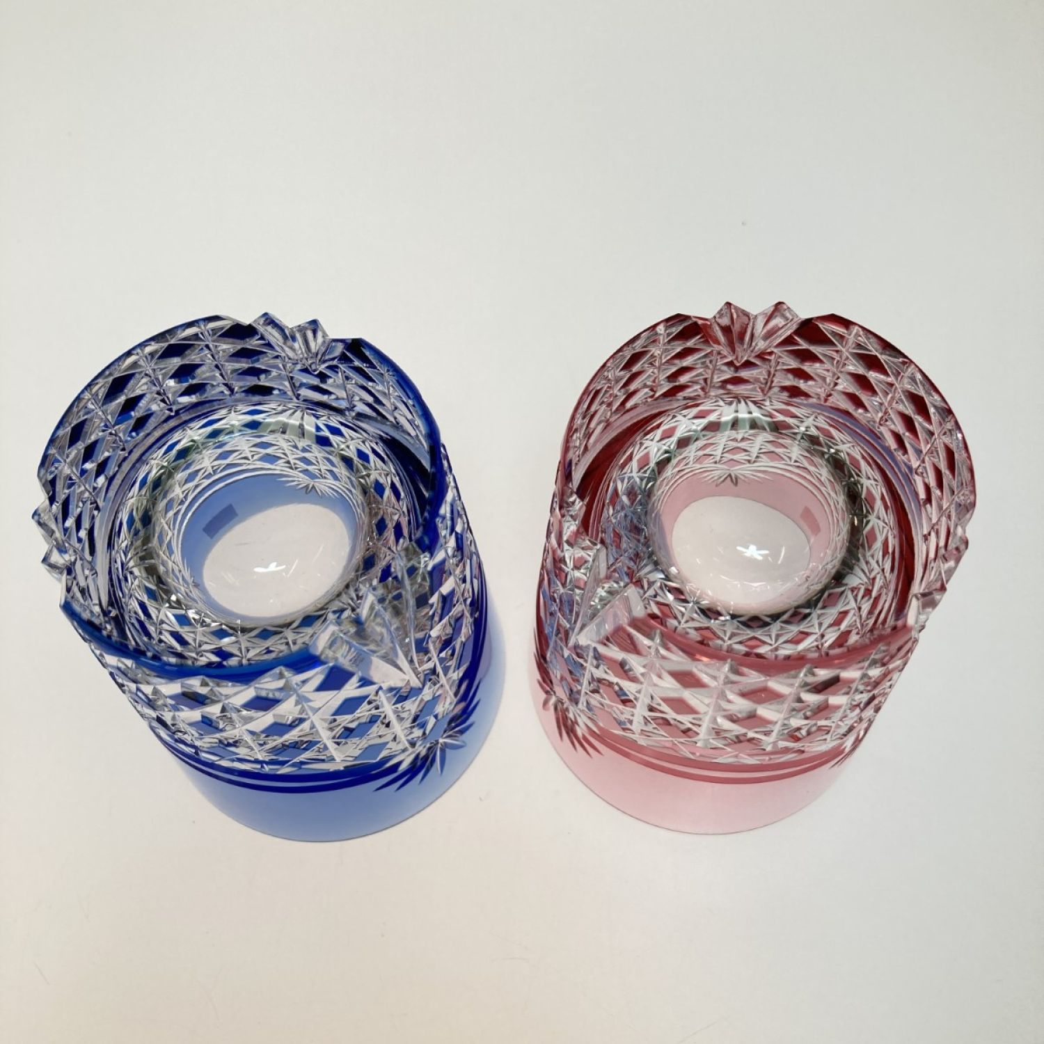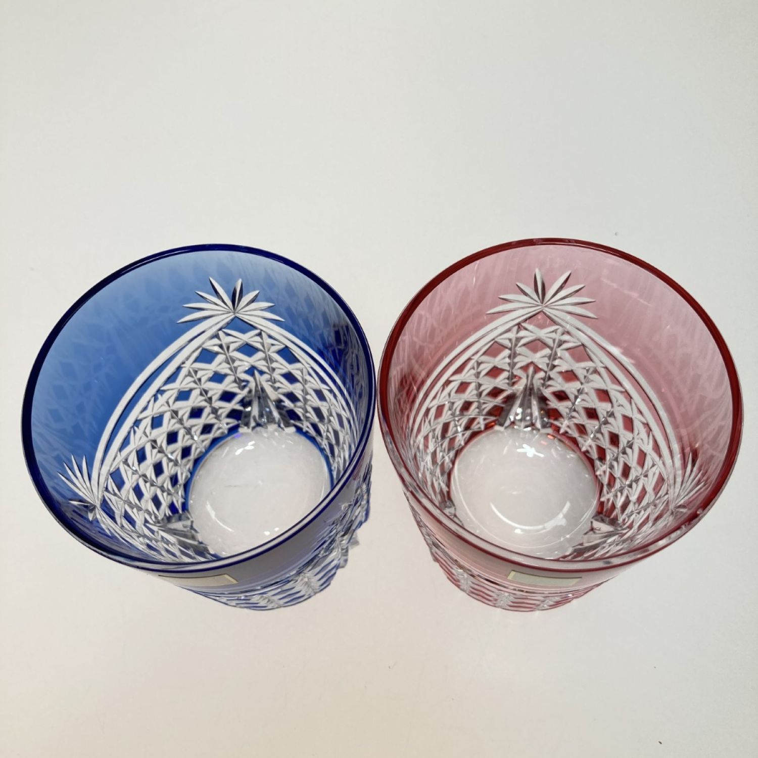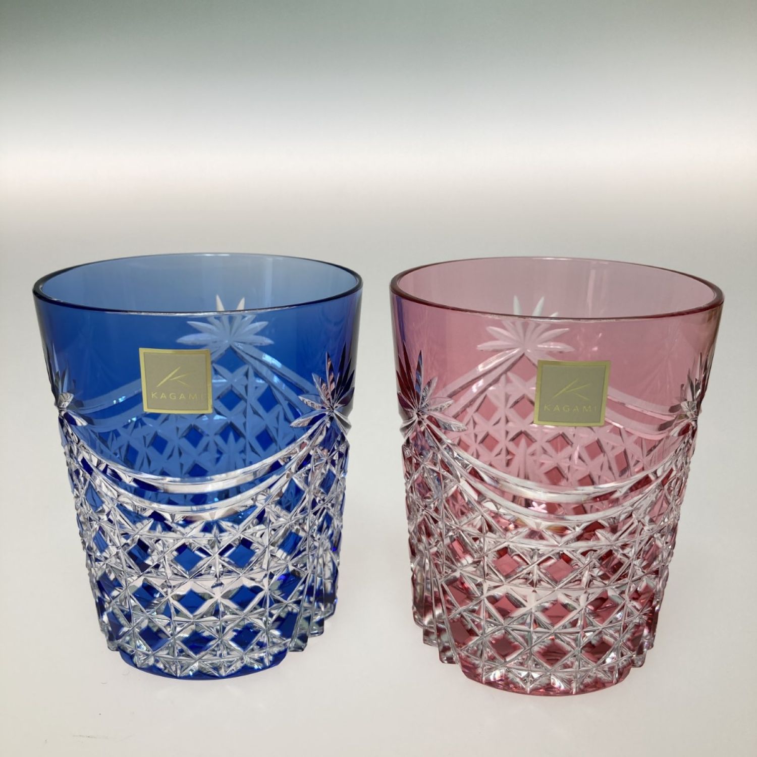カガミクリスタル 江戸切子 ペアロックグラス<幕襞に四角籠目> 赤 x 青