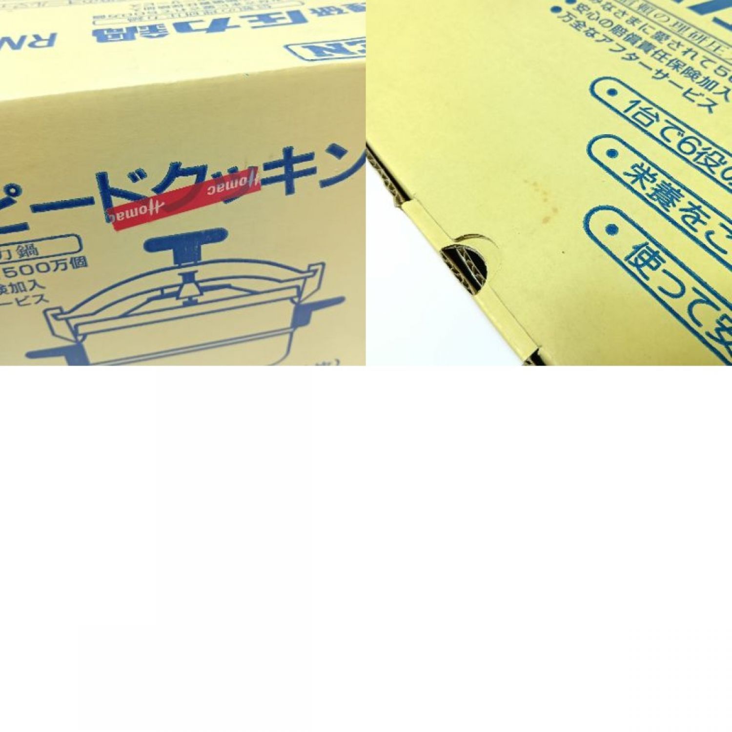 外箱にシールの付着、シミ、擦れなどの傷みがみられます。