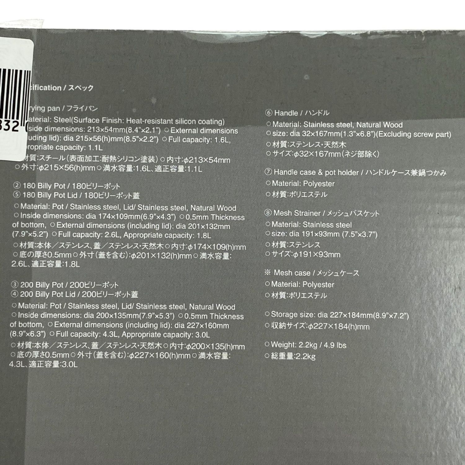 フライパン、180ビリーポット、200ビリーポット、メッシュバスケットの4点セットです。
