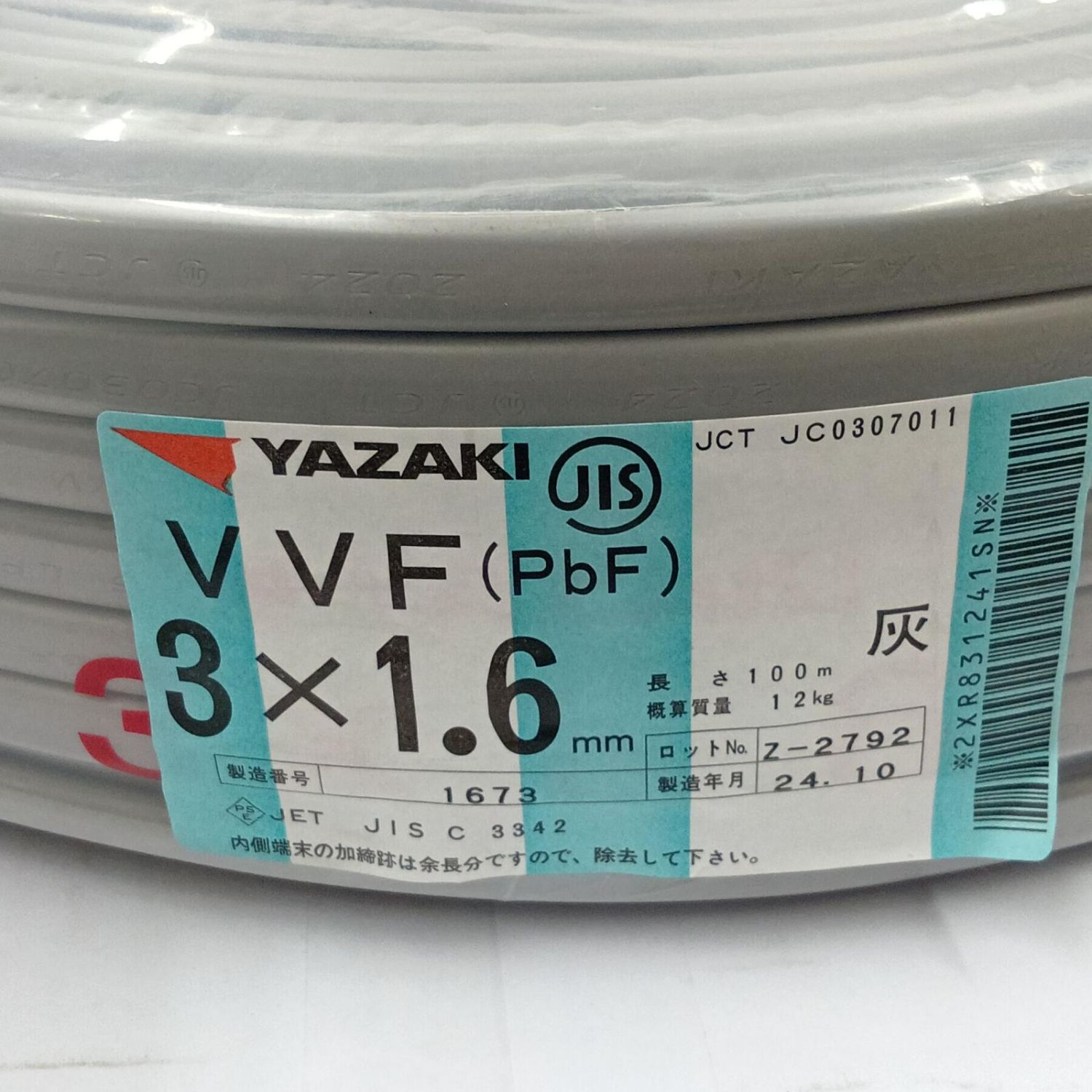 VVFケーブル 電材 3芯 1.6mm×100m 24.10製造