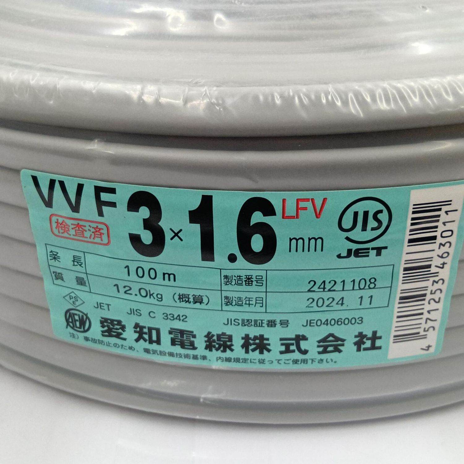 【商品名】中古 愛知電線 電材 VVFケーブル 3芯×1.6mm 100m 24.11 Sランク