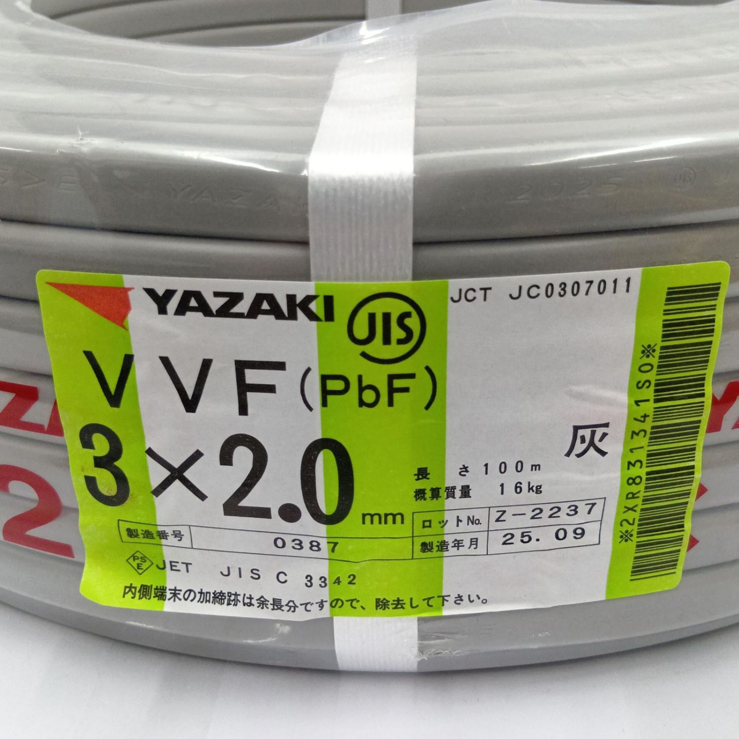 YAZAKI VVFケーブル 電材 3芯 2.0mm×100m 25.9製造