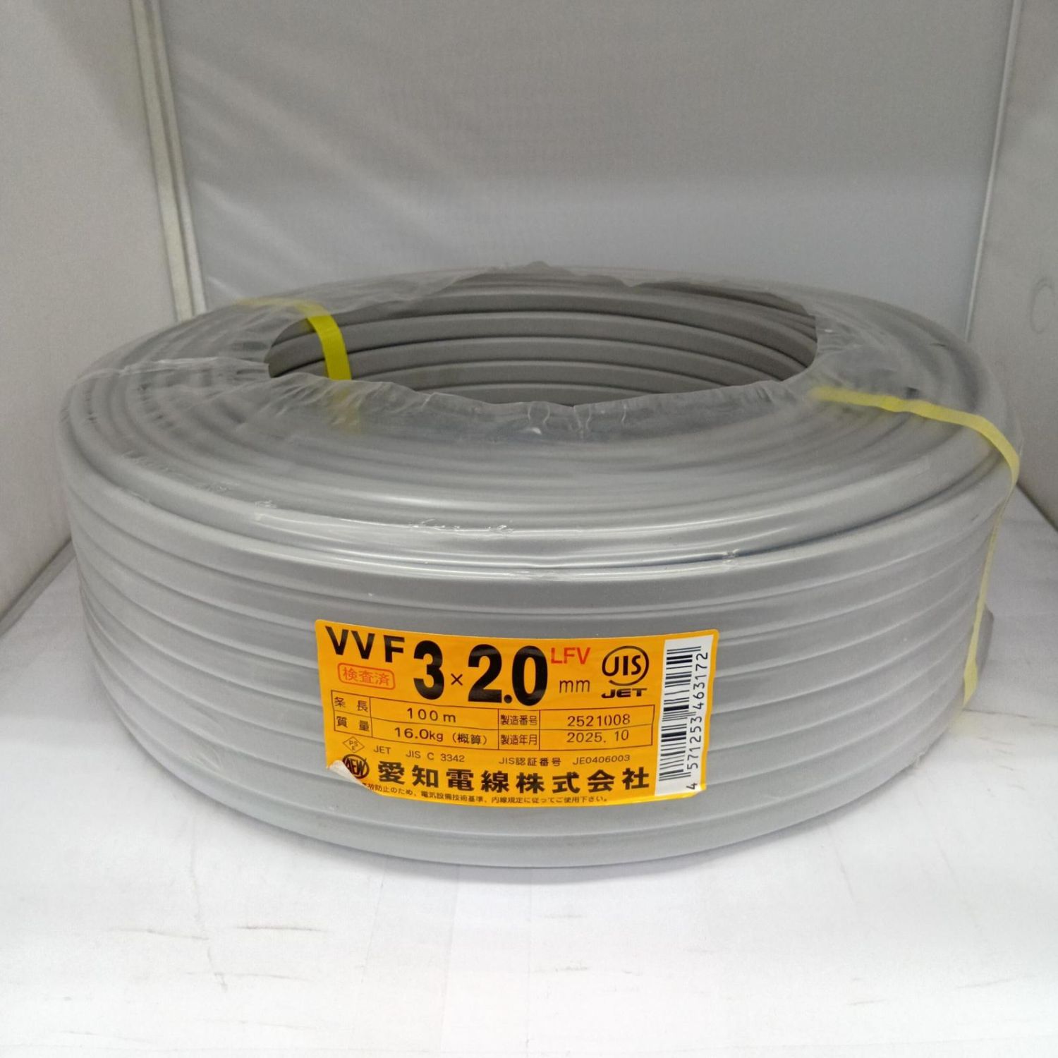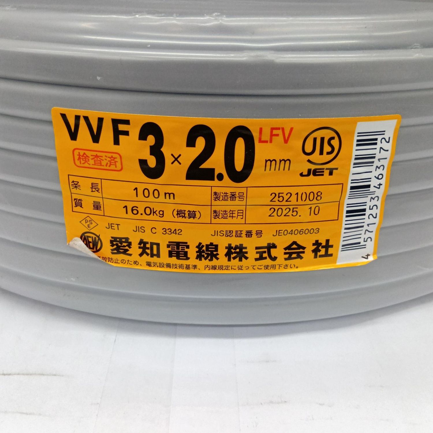愛知電線 VVFケーブル 電材 3芯 2.0mm×100m 2025年10月製造