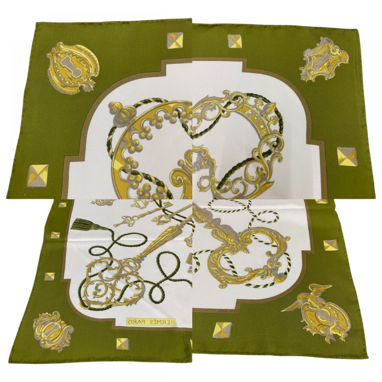 【商品名】中古 HERMES エルメス カレ90 鍵柄 大判シルクスカーフ オリーブ Bランク