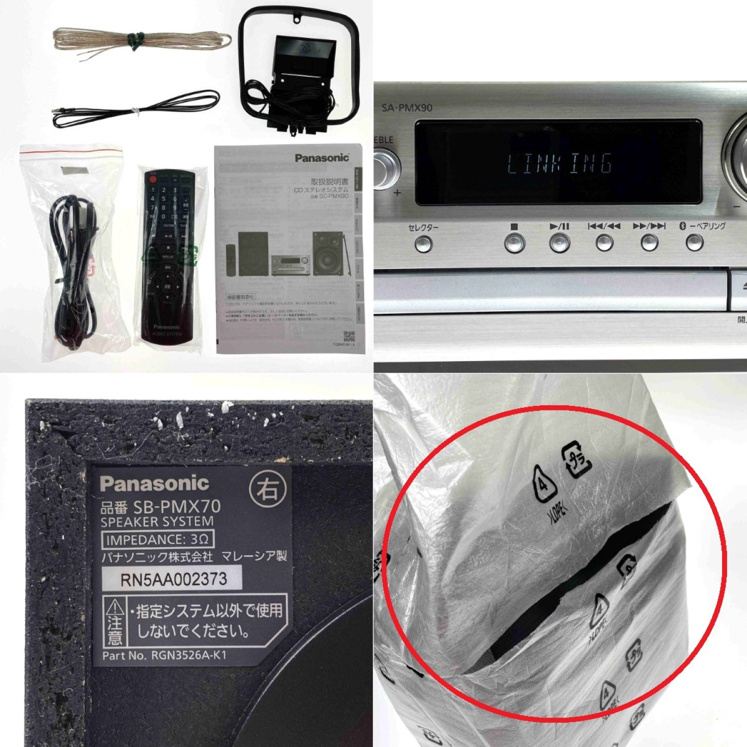 スピーカーを包んでいる梱包材に破れがございます。