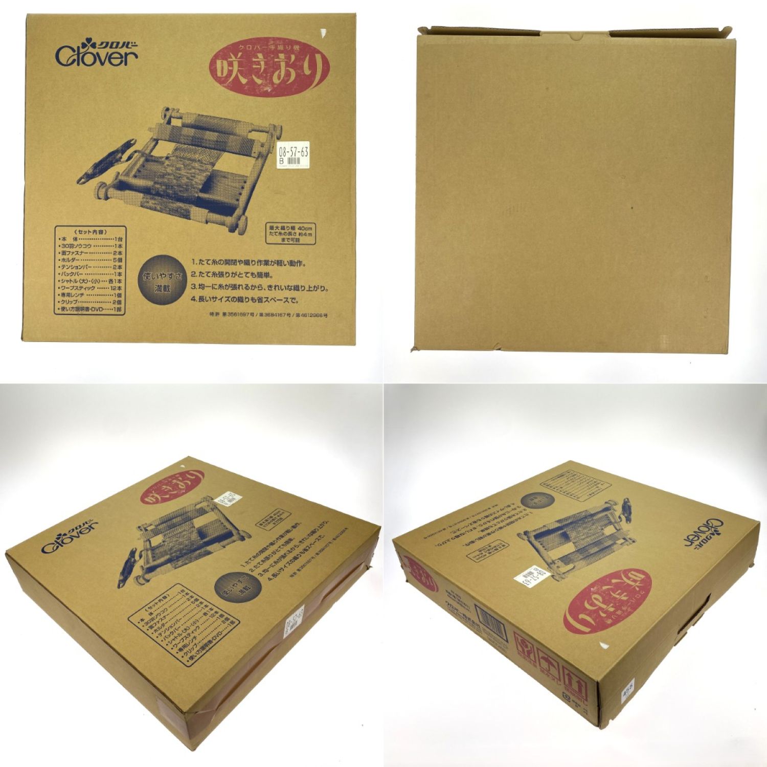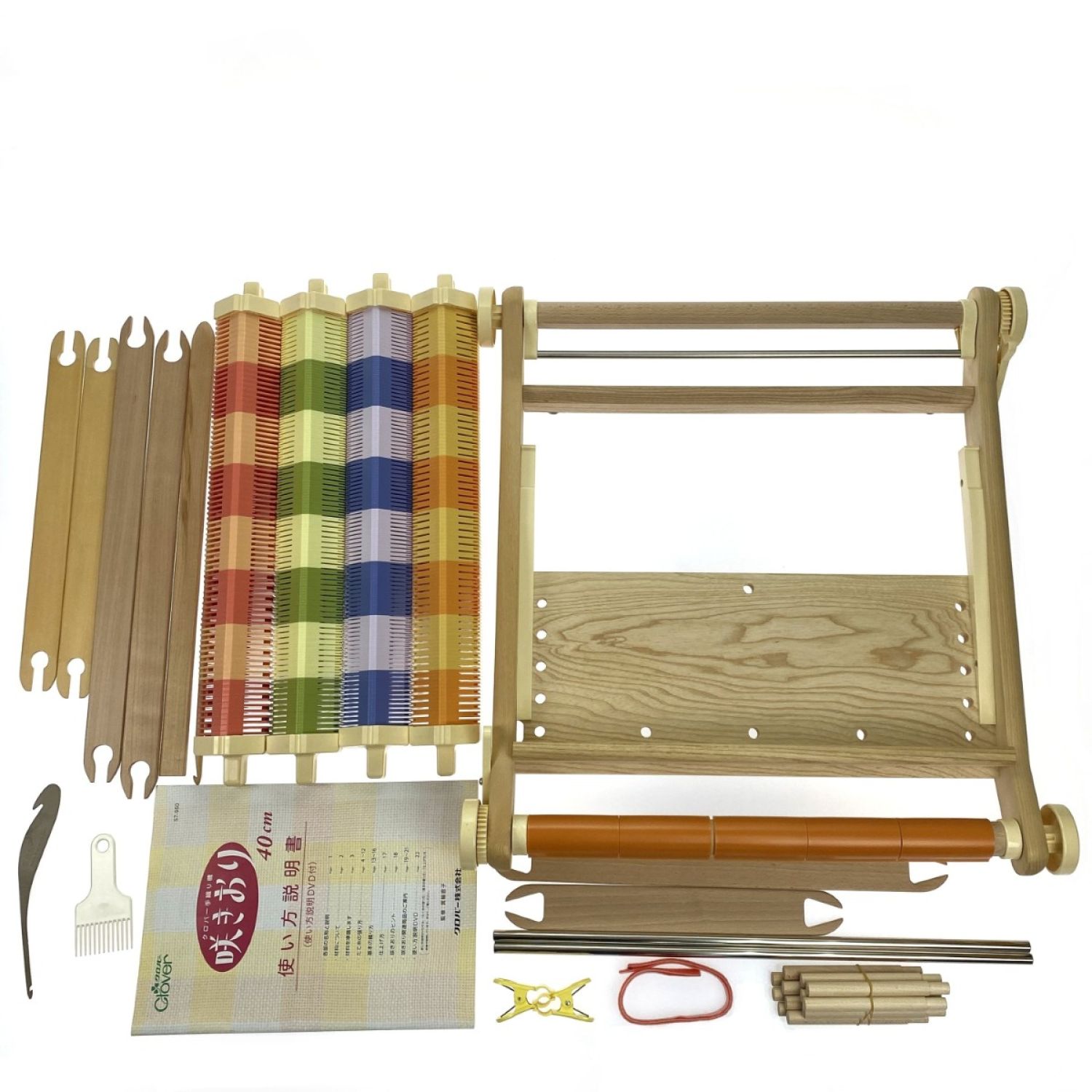 【付属品】 標準セット30羽ソウコウ(40cm)1本、20羽ソウコウ(40cm)1本、40羽ソウコウ(40cm)1本、50羽ソウコウ(40cm)1本、標準シャトル(41cm)1本、標準シャトル(30cm)1本、シャトル(46cm)2本、シャトル(36cm)2本、ホルダー5個、ワープスティック12本、テンションバー2本、クリップ2個、面ファスナー2本、使用説明書、取扱説明DVD、ピックアップスティック、かぎ棒、くし、そうこう筬通し、外箱
