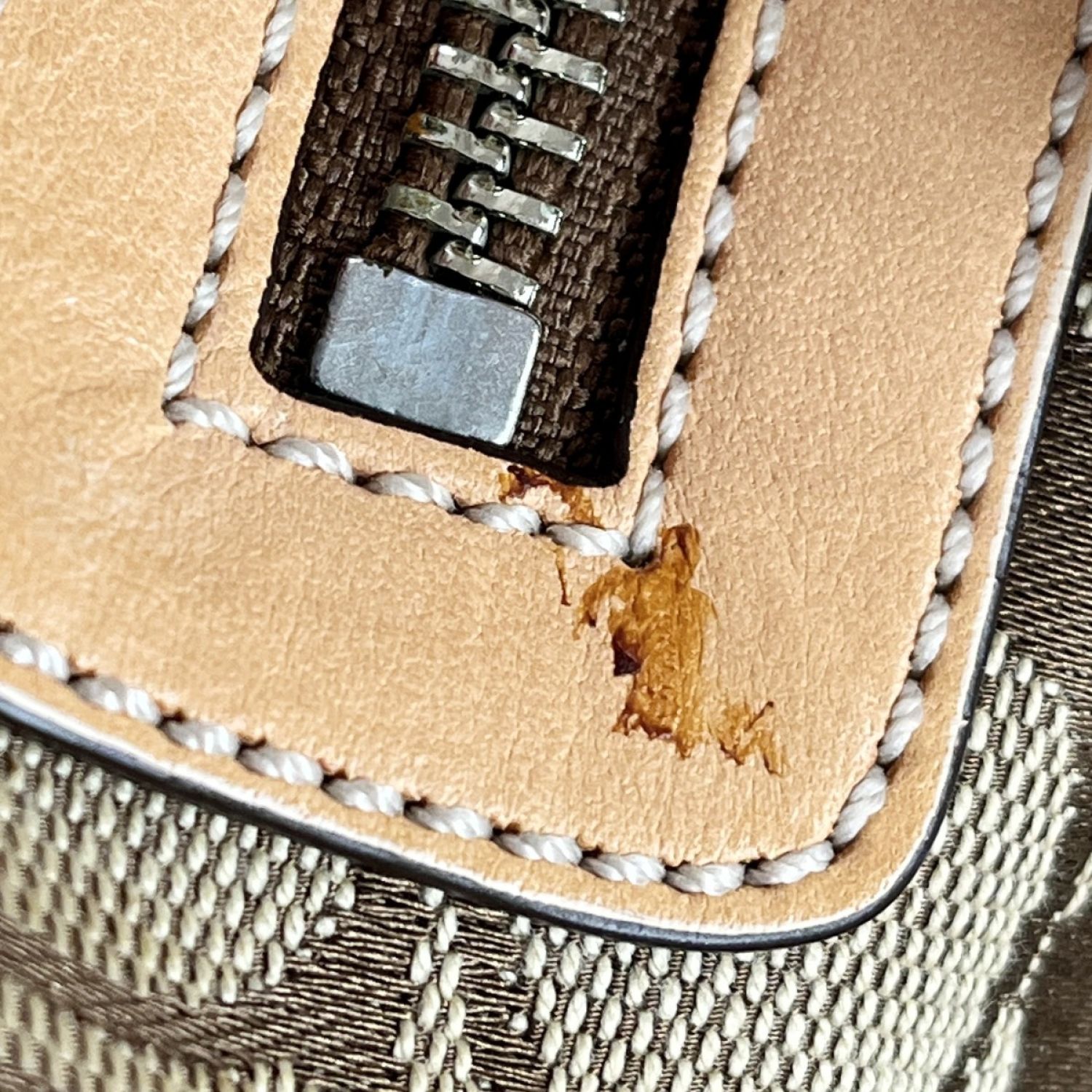 底面と外ポケットのファスナー付近に汚れがございます。チャームに少し錆汚れがございます。