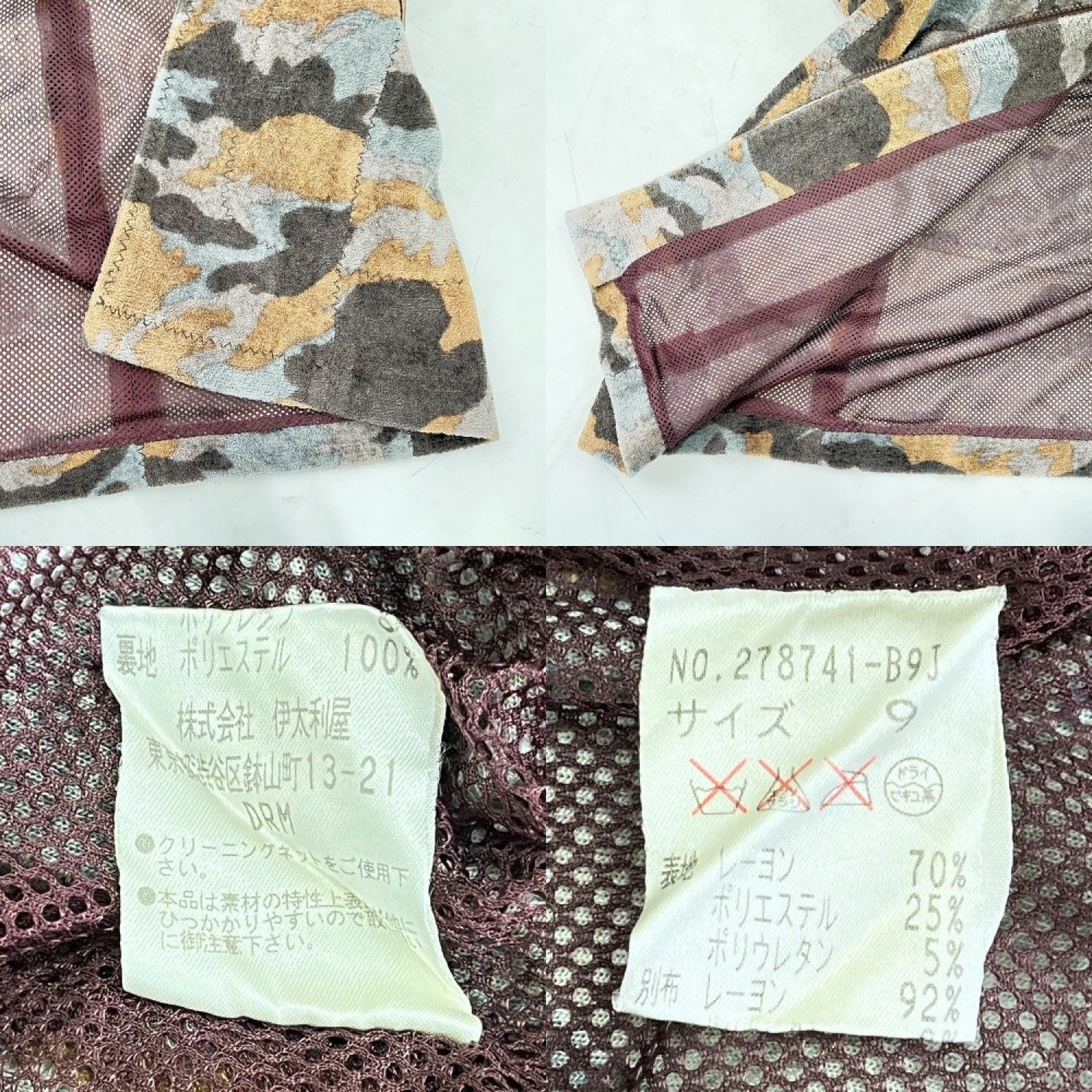 【商品名】中古 ITALIYA イタリヤ 伊太利屋 フード付ベスト 迷彩 9号 レディース ブラウン Bランク