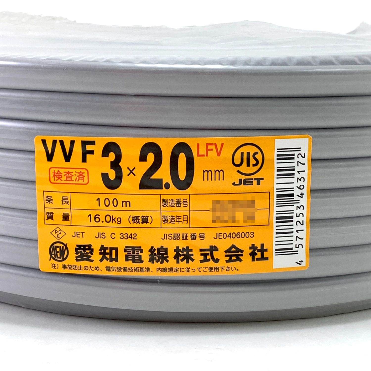 【商品名】中古 愛知電線 VVFケーブル 3×2.0mm 100m 16.0kg グレー/赤・白・黒 MFV Nランク