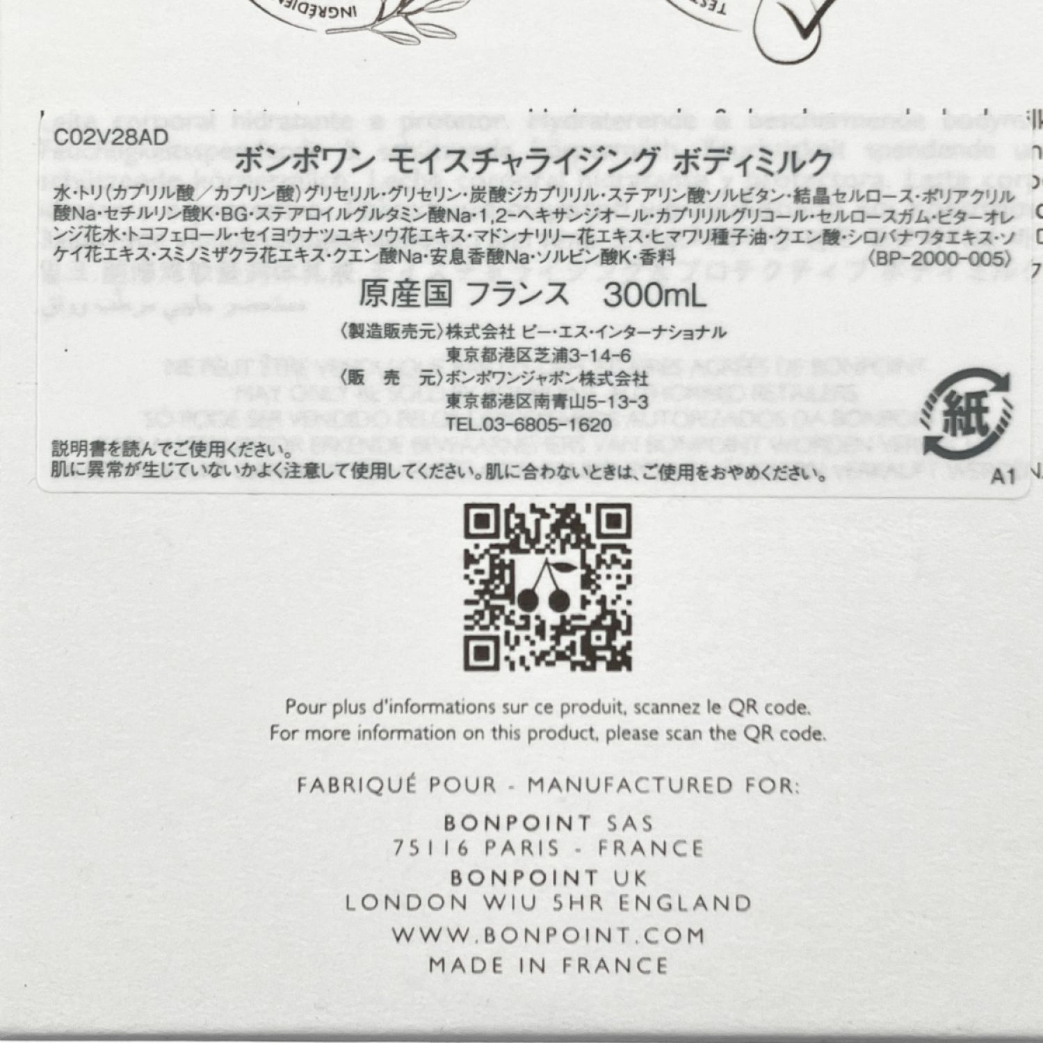 ボンポワン モイスチャライジング ボディーミルク ポンプタイプ 300ml 開封未使用品