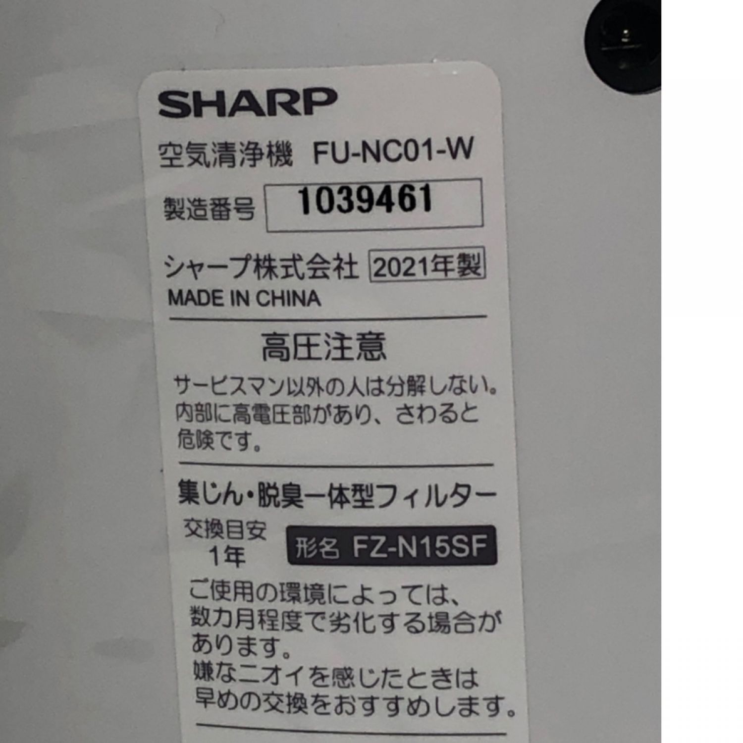【商品名】中古 SHARP シャープ 空気清浄機 プラズマクラスター発生機 2021年製 FU-NC01-W ホワイト 外箱・取説付属 Sランク