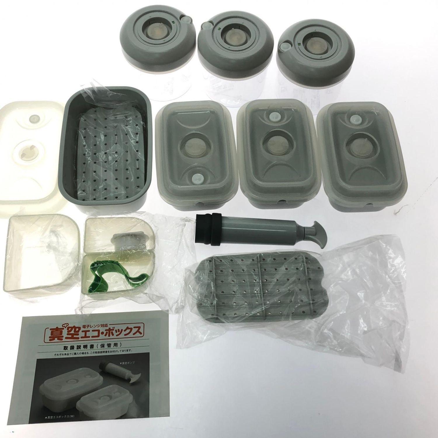 【付属品】外箱,取扱説明書 ・真空エコボックスM(ストレーナー付)×1・真空エコボックスS×3・真空フレッシュボックス×3・お弁当アクセサリーセット・真空ポンプ