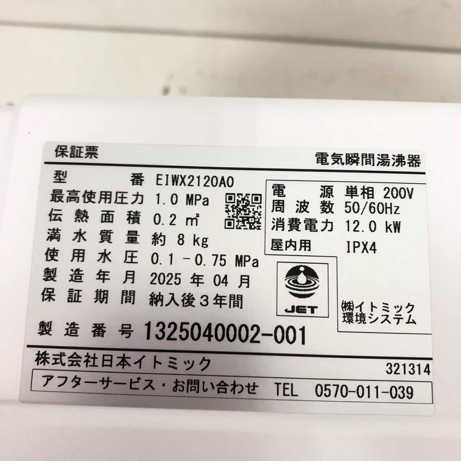 【商品名】中古 Itomic 日本イトミック 電気瞬間湯沸器 EIWXシリーズ 2025年4月製造 本体のみ EIWX220A0 ホワイト Sランク