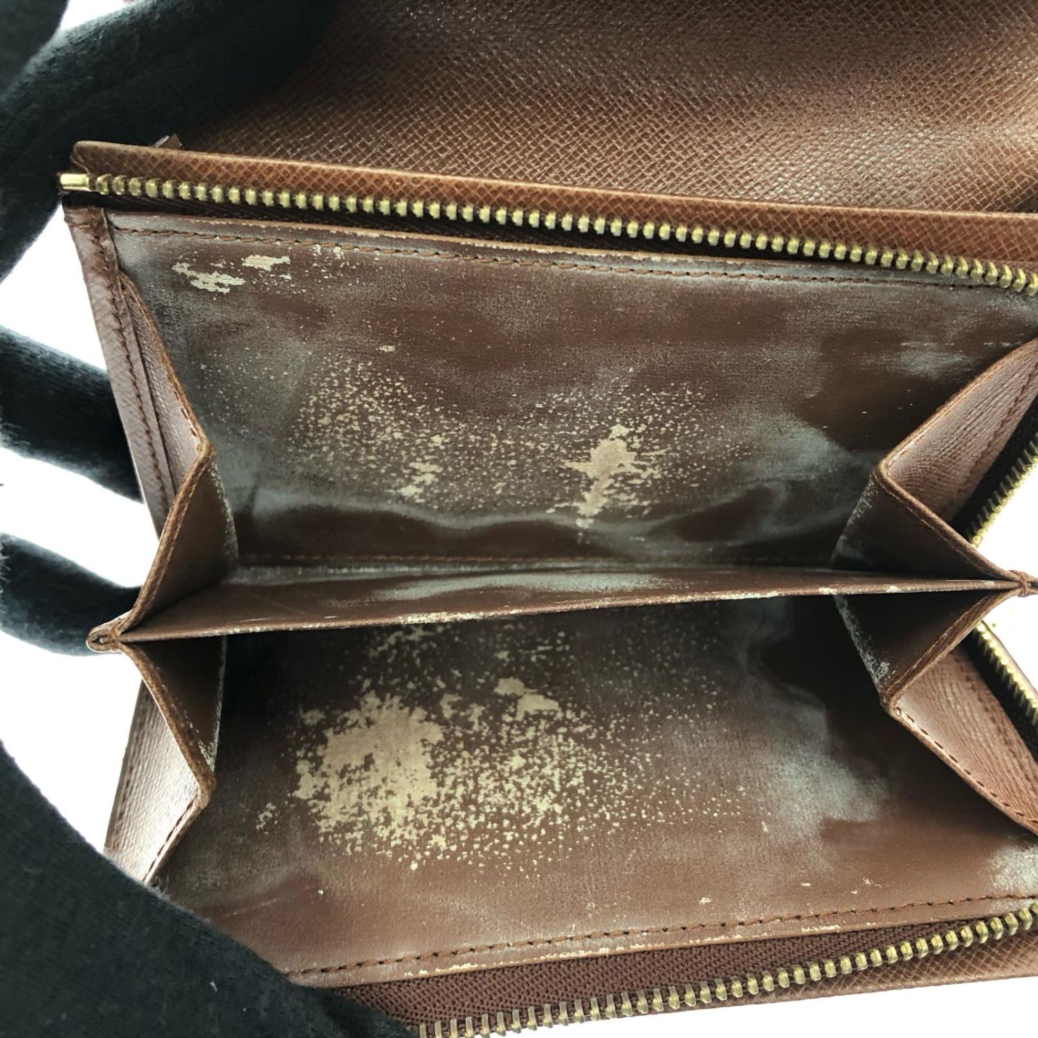 外観は角スレや糸切れなく綺麗ですが、小銭入れの中が剥がれ、変色しています。
