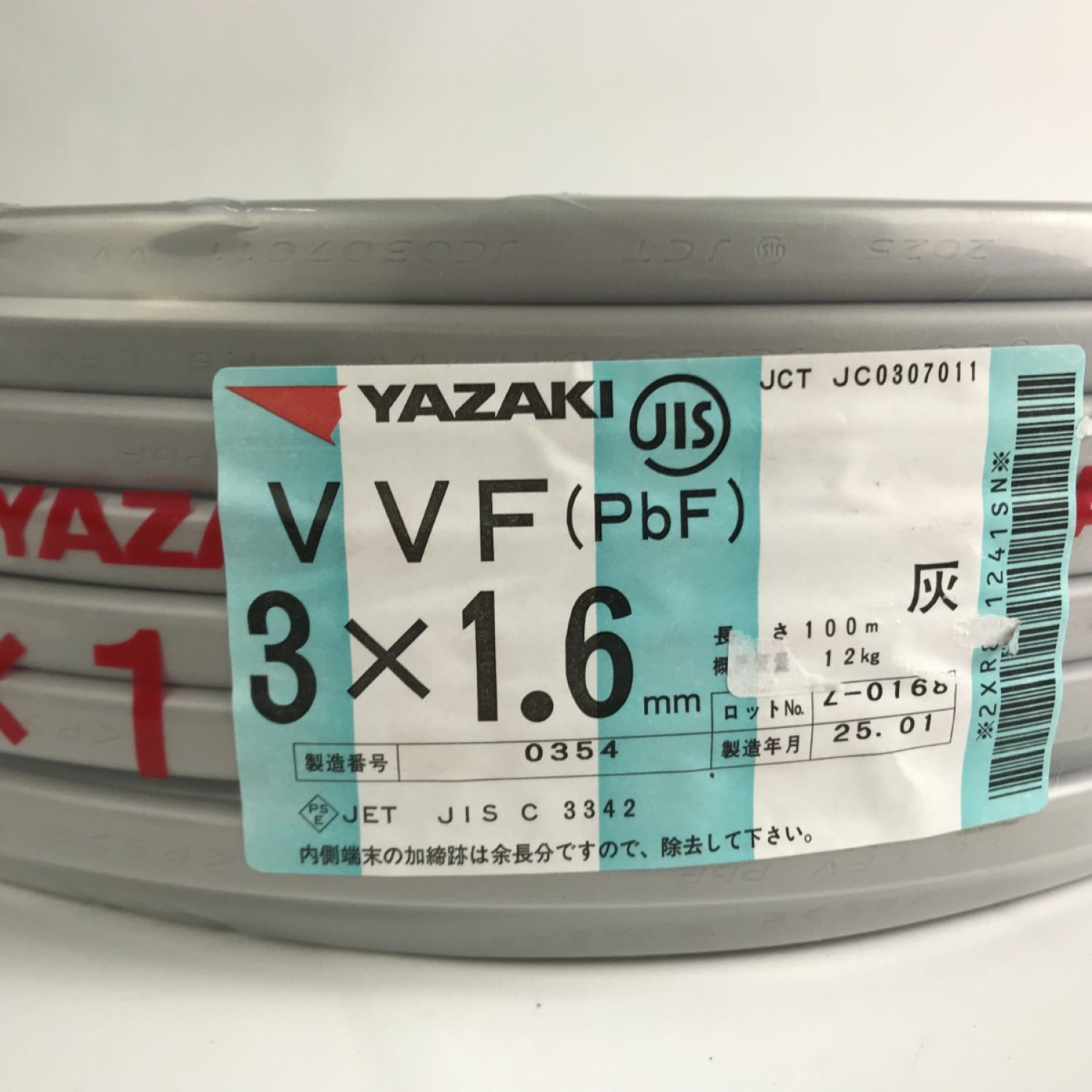 【商品名】中古 YAZAKI 電材 VVFケーブル 3芯×1.6mm×長さ100m 2025年1月製造 Nランク