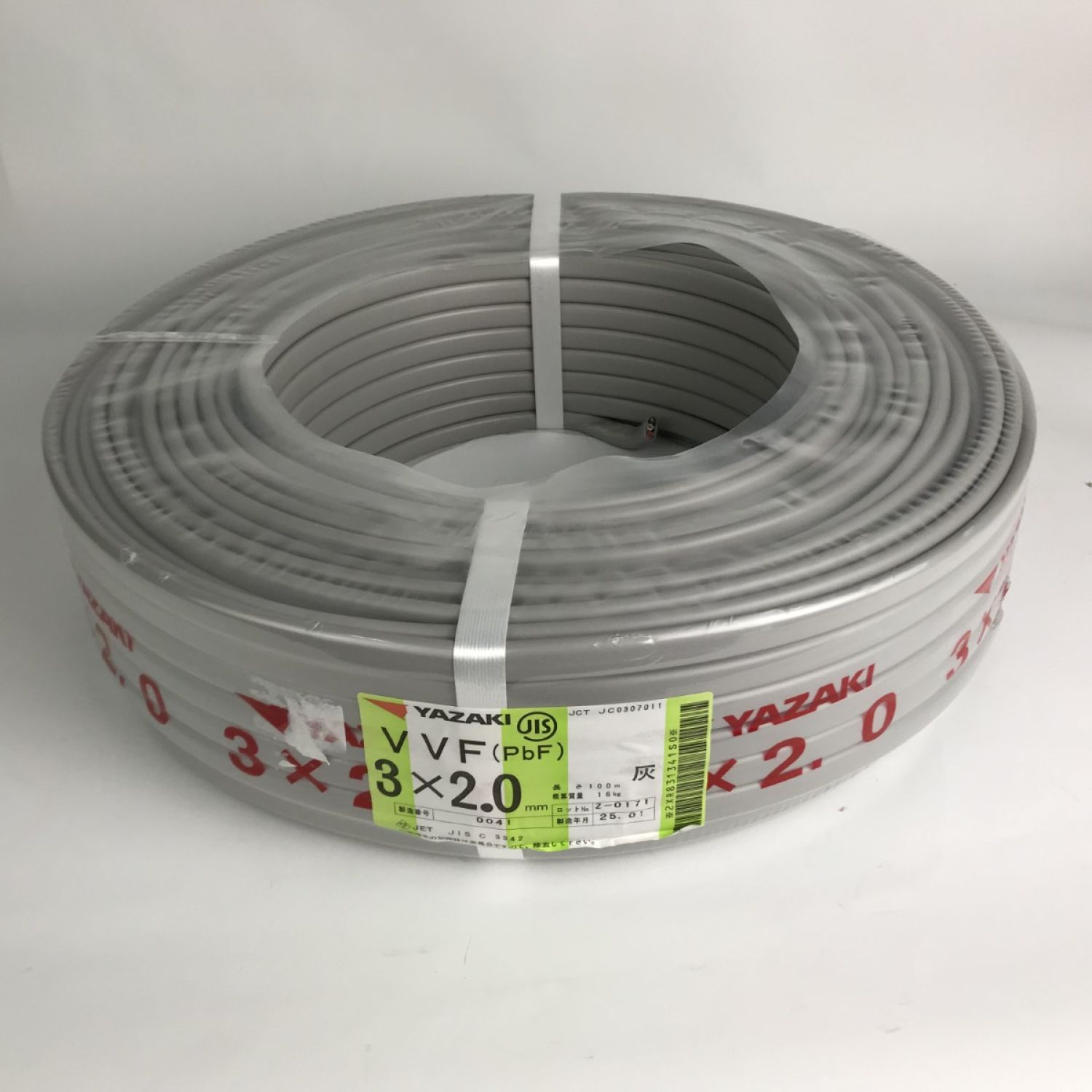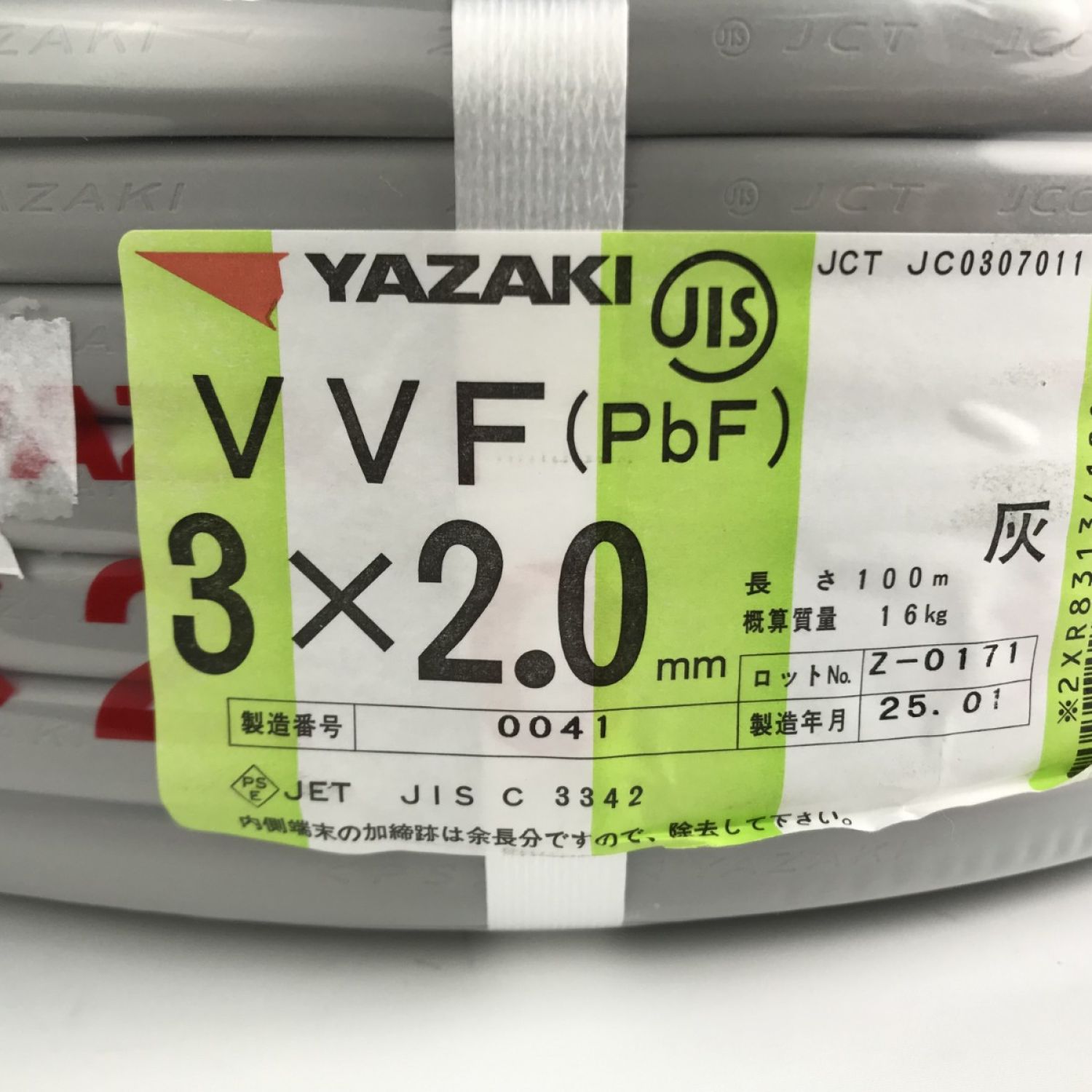【商品名】中古 YAZAKI 電材 VVFケーブル 3芯×2.0mm×長さ100m 2025年01月製造 Nランク