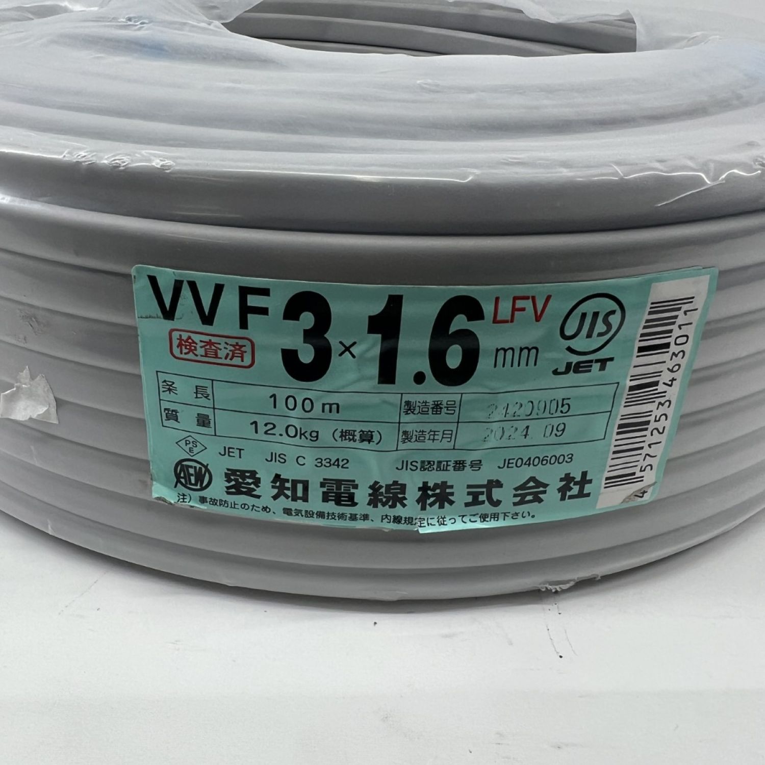 【商品名】中古 愛知電線 電材 VVFケーブル 3芯 3× 1.6 LFV 100m 未開封品 2024年9月製造 Nランク