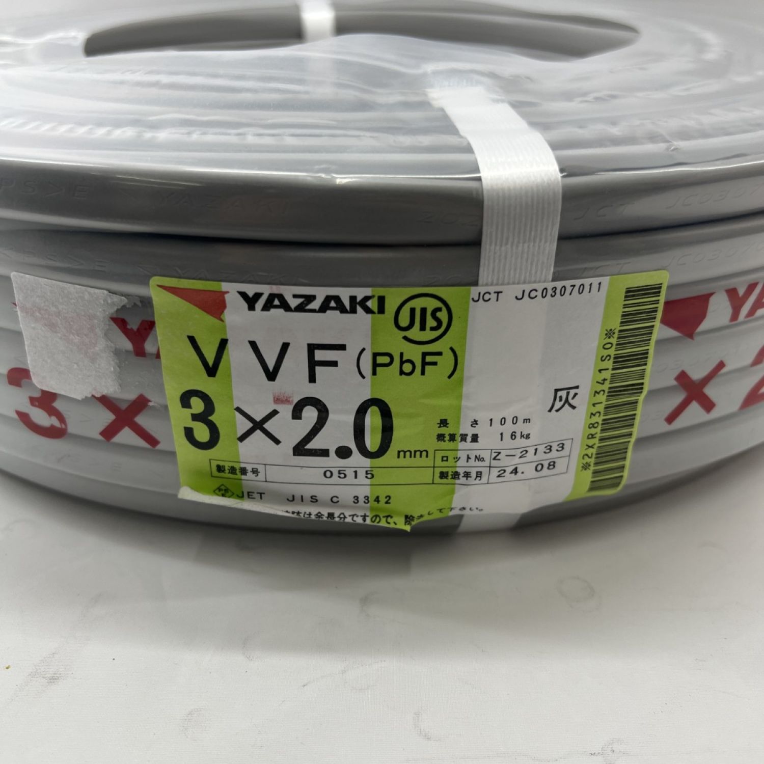 【商品名】中古 YAZAKI 電材 VVFケーブル 3芯 3× 2.0 PbF 100m 未開封品 Nランク