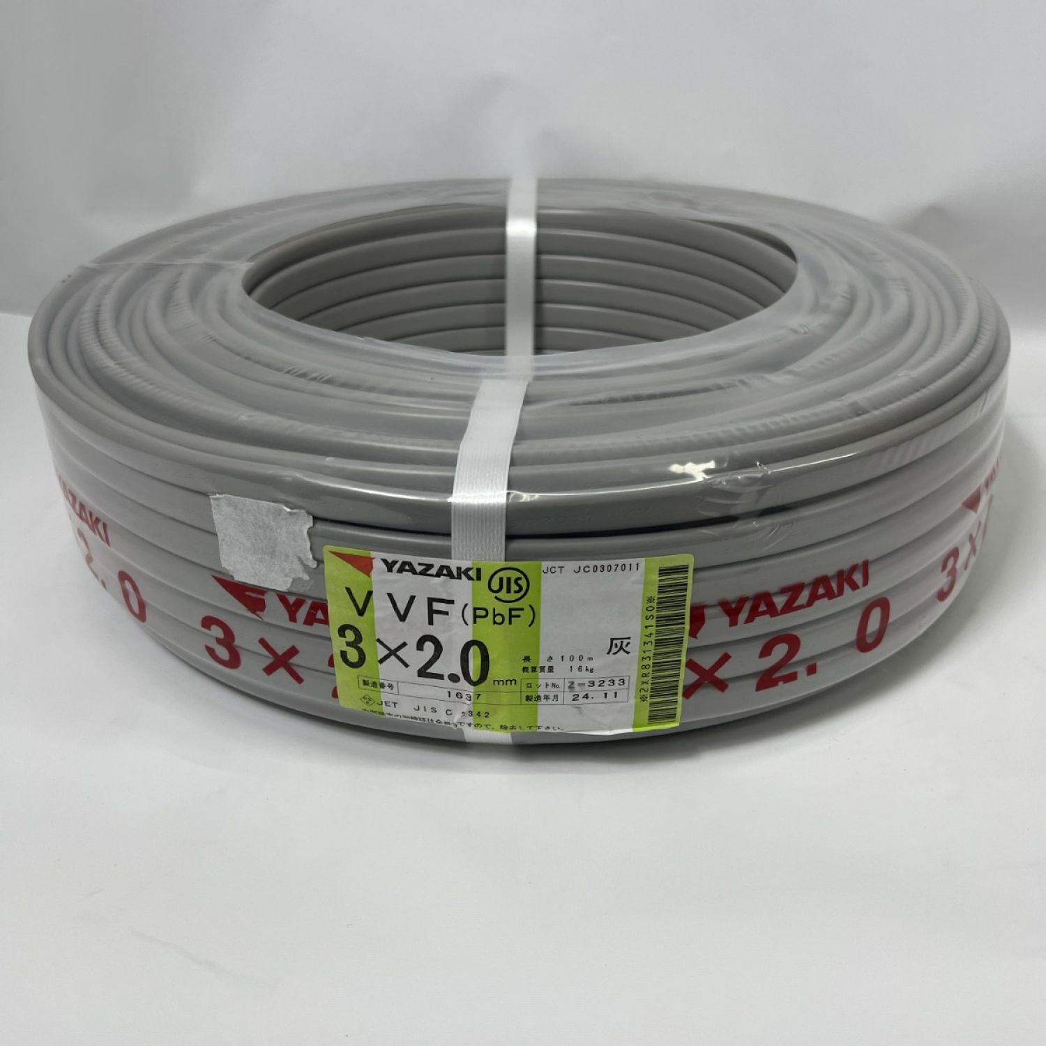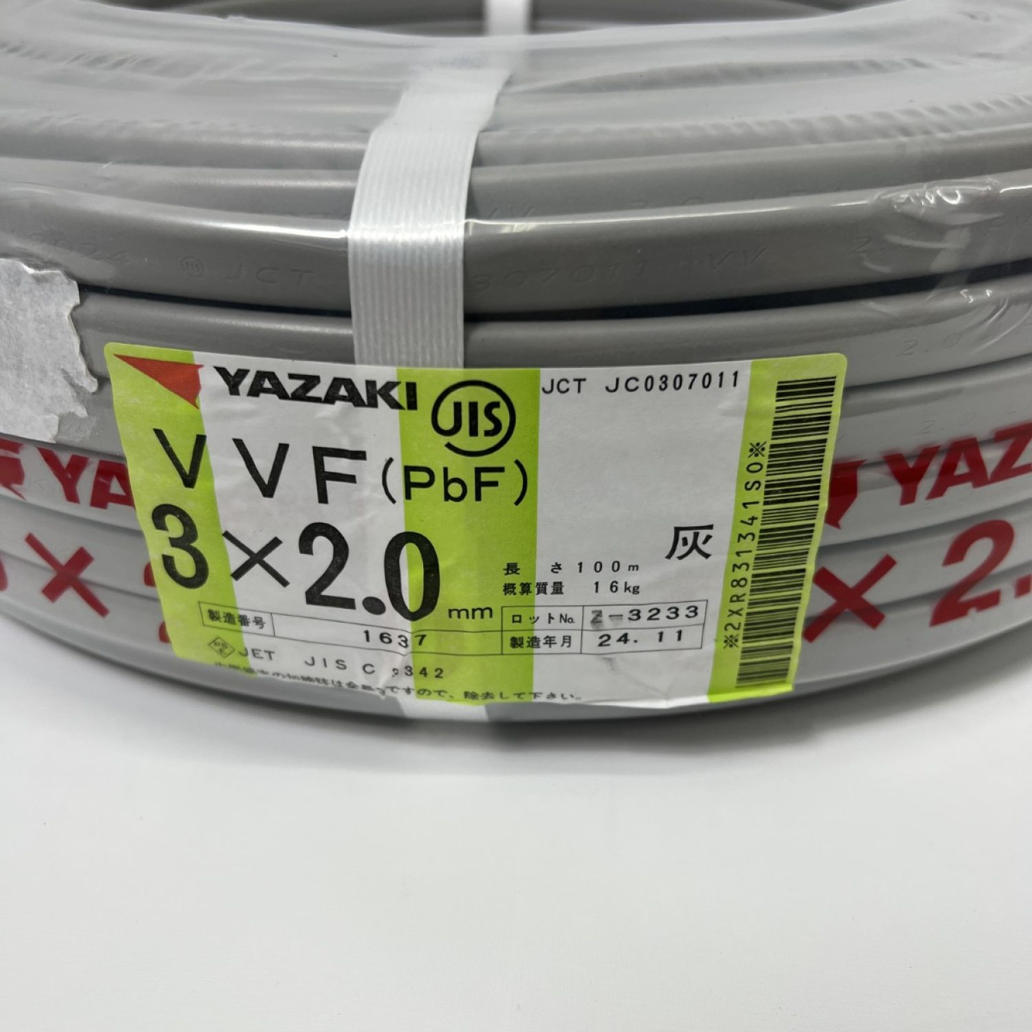 【商品名】中古 YAZAKI 電材 VVFケーブル PbF 未開封品 2024年11月製造 3芯 2.0mm×100m Nランク