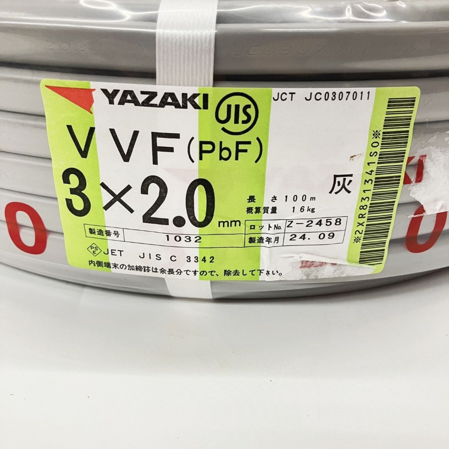 【商品名】中古 YAZAKI ヤザキ 電材 VVFケーブル 3芯 3× 2.0 PbF 100m 未開封品 Nランク