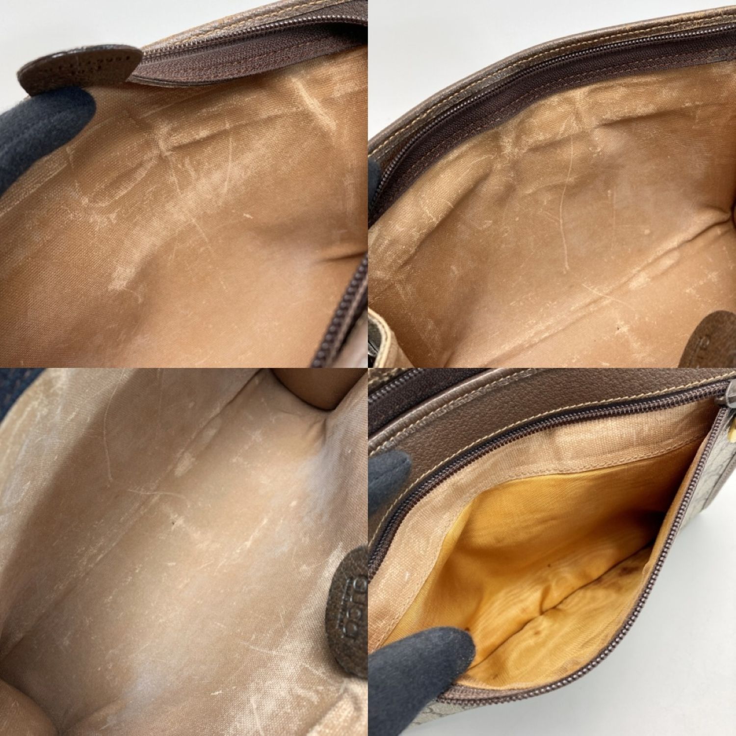 金具にキズ・汚れ・剥げ有。角スレ有。レザーにスレ・キズ・汚れ有。内側に劣化・キズ・汚れ・剥げ・ニオイ有。外側ファスナー開きにくいです。ポケット内に汚れ有。