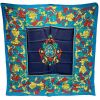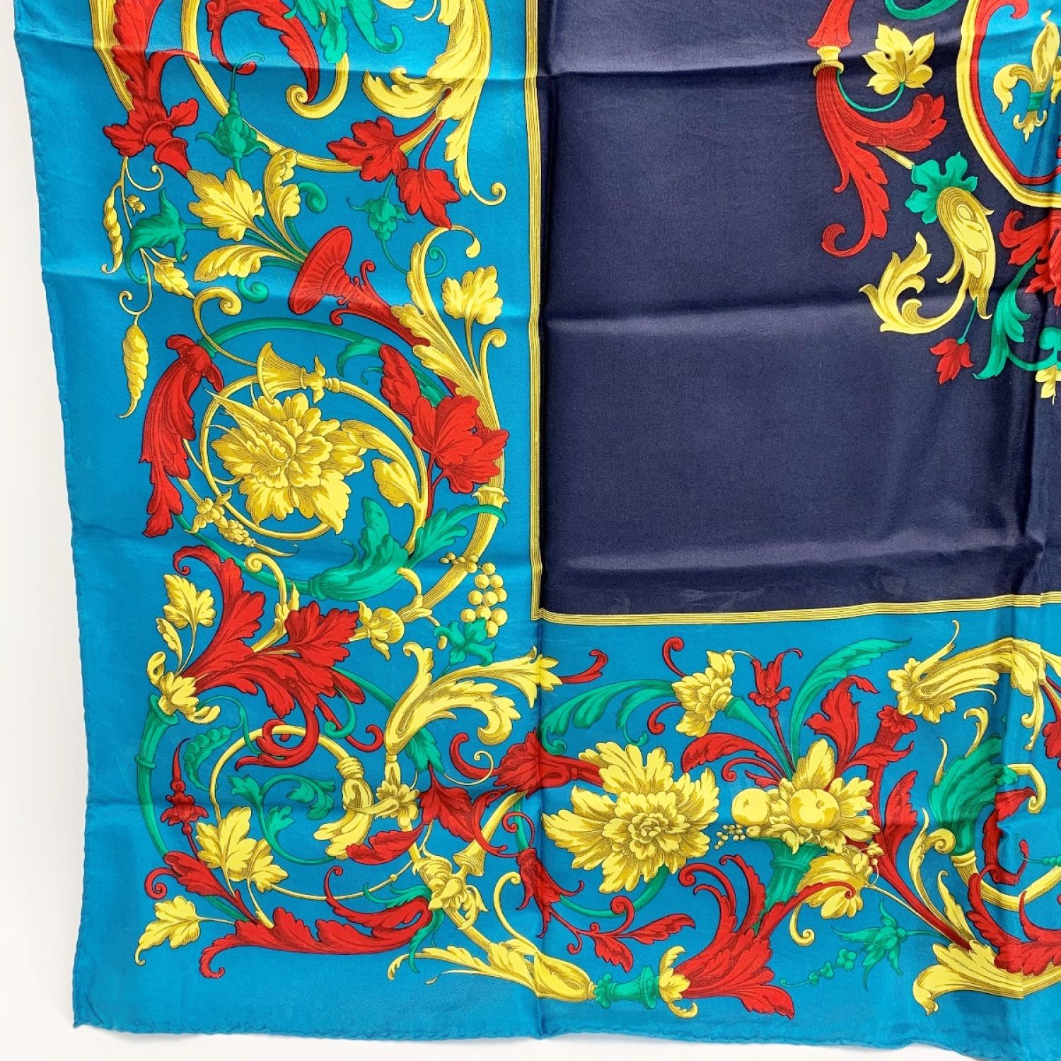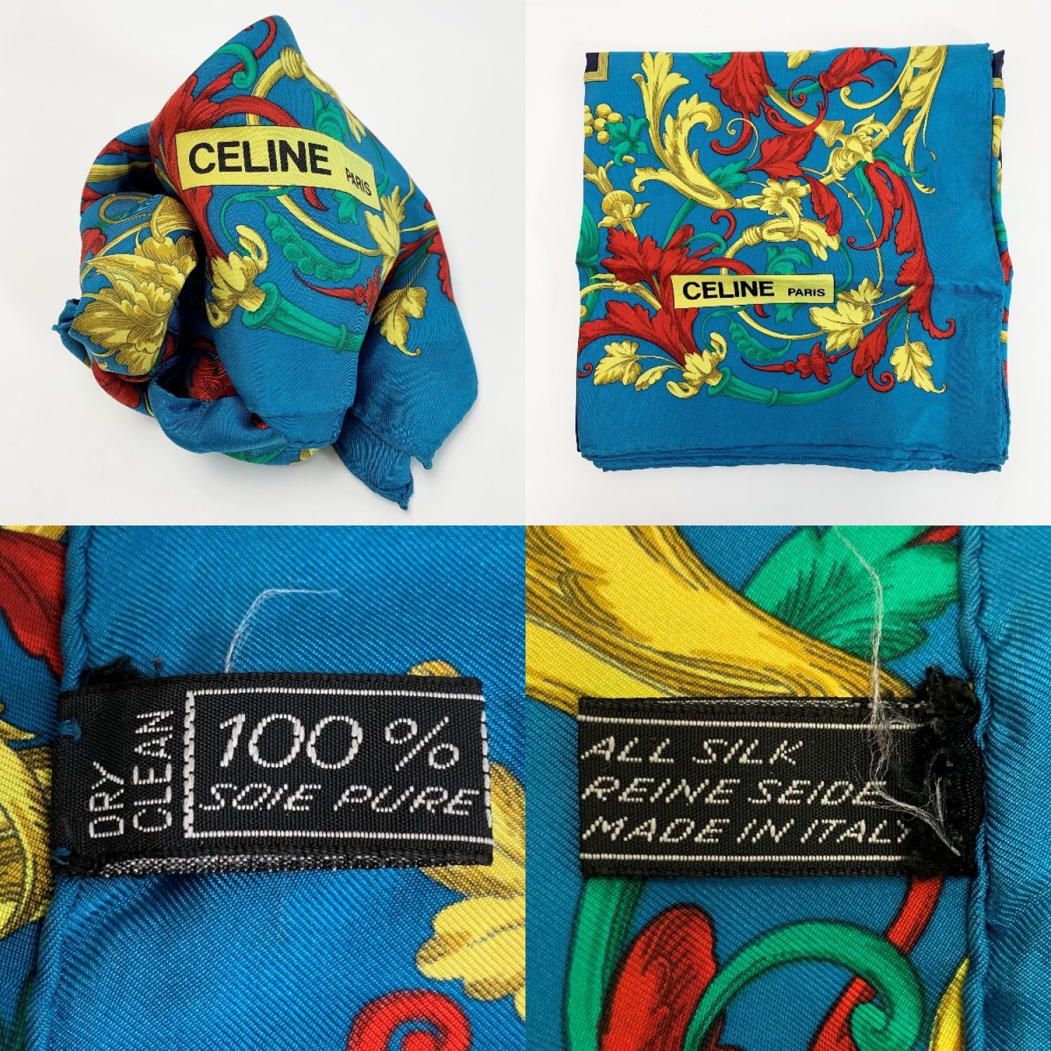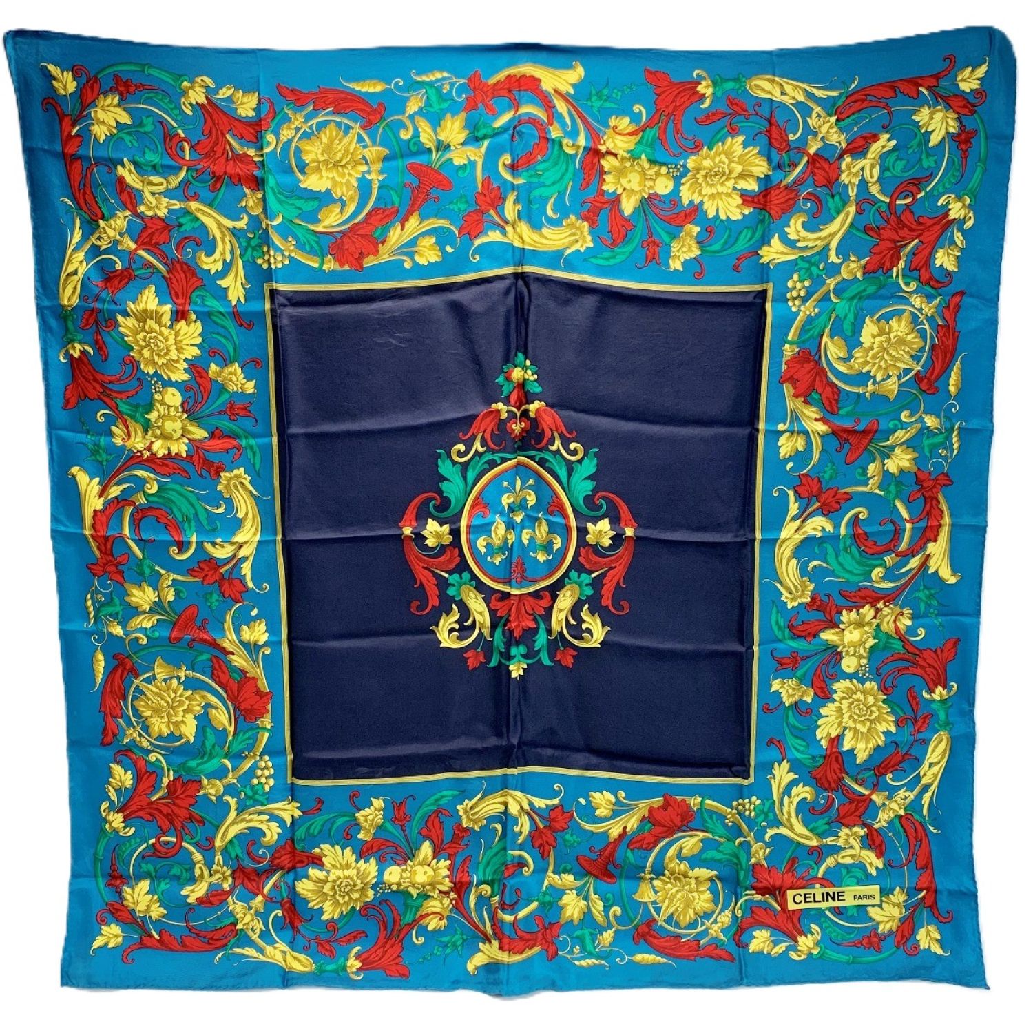 CELINE セリーヌ シルクスカーフ 花柄 ターコイズブルー シルク100%