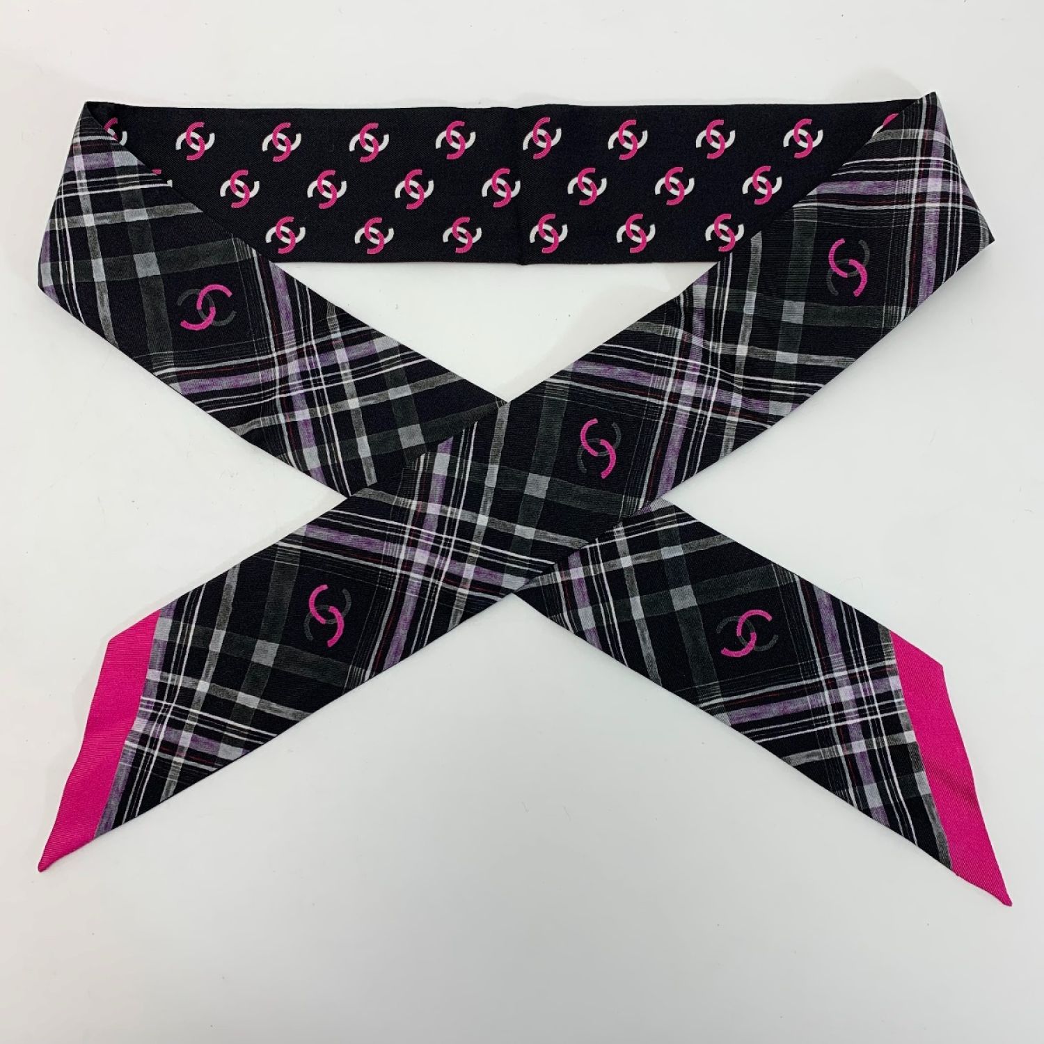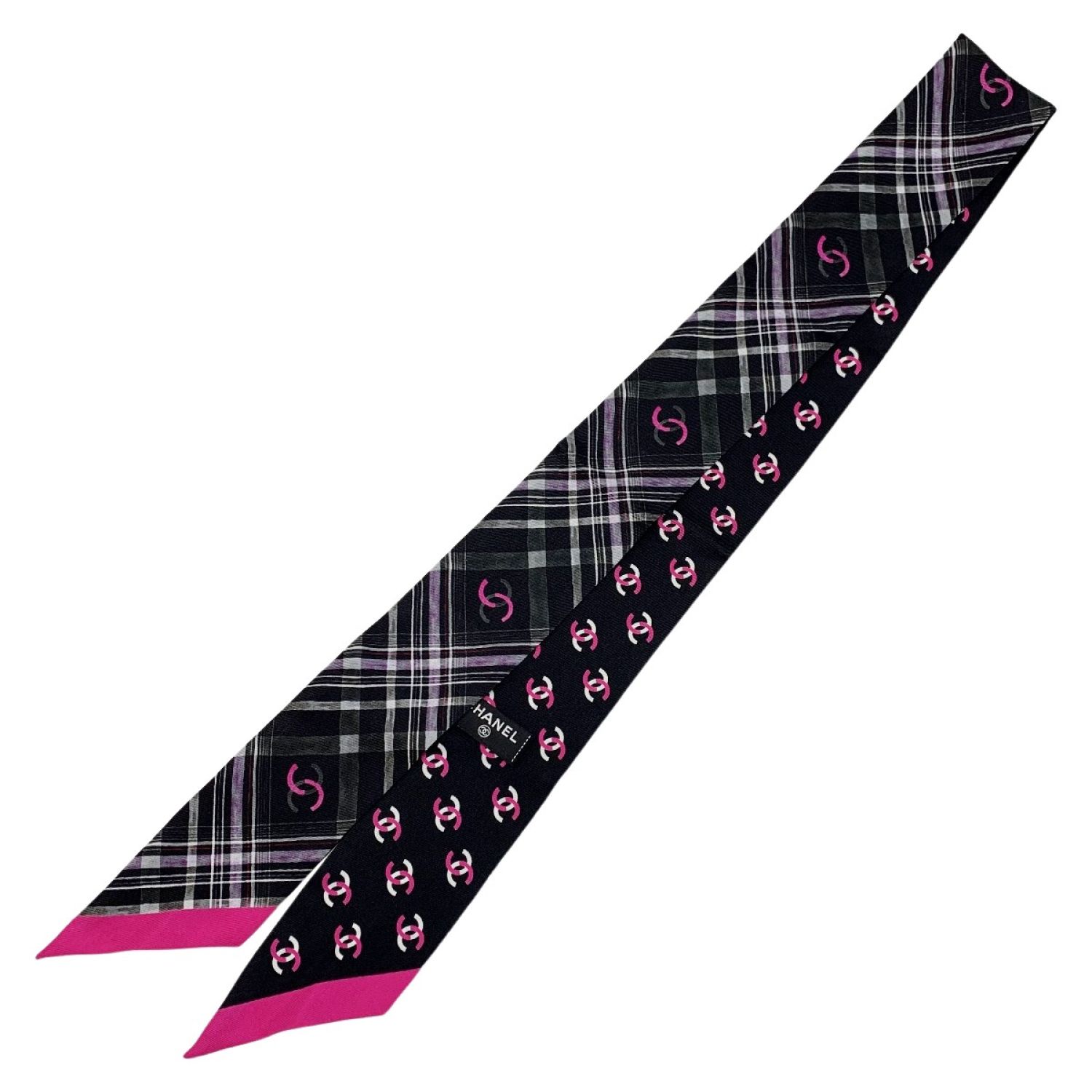 CHANEL シャネル ヘアバンド 細いスカーフ ツイリー ブラック×ピンク シルク100%