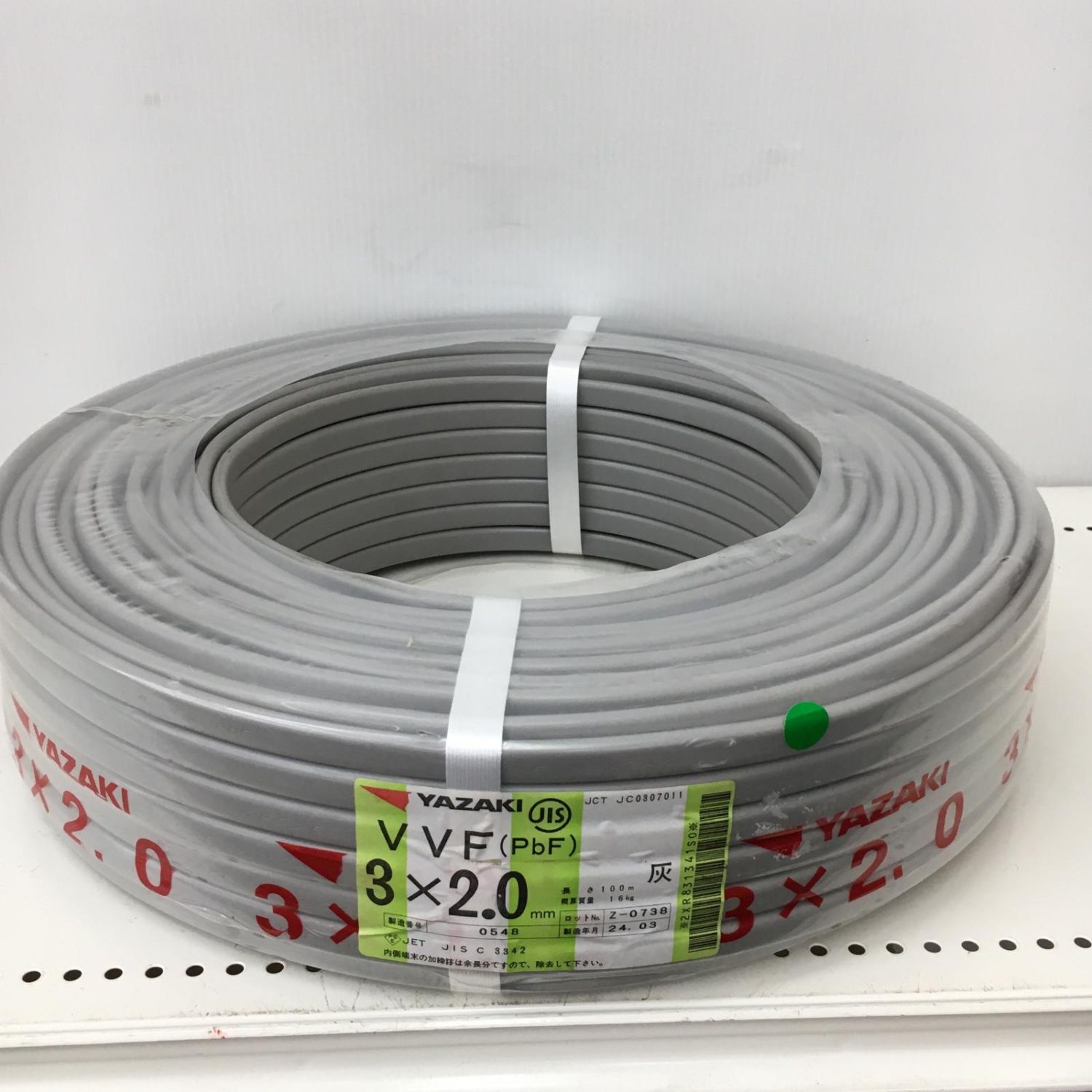 【商品名】中古 YAZAKI 電材 VVFケーブル グレー 3芯2.0㎜×100m 2024年10月製造 Sランク