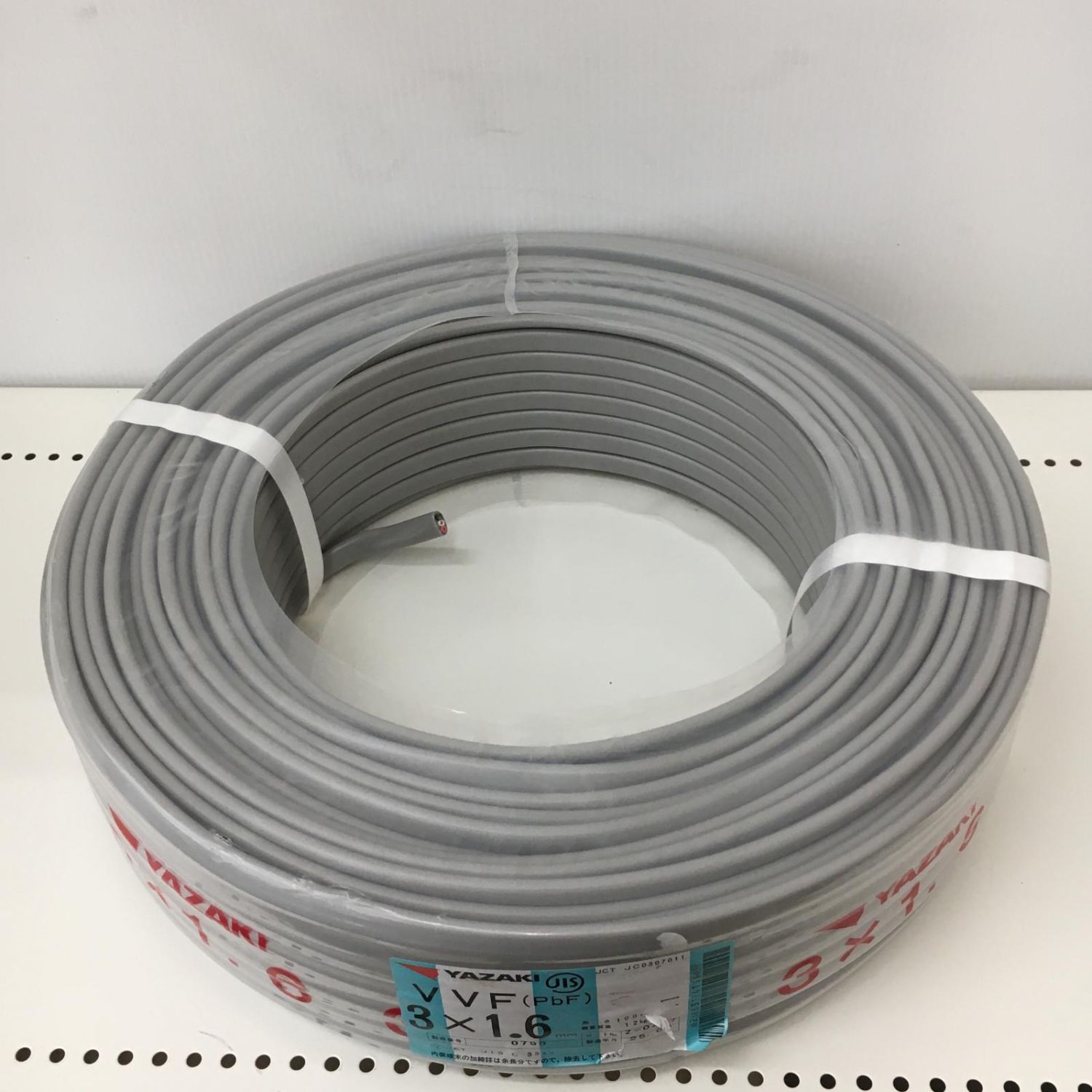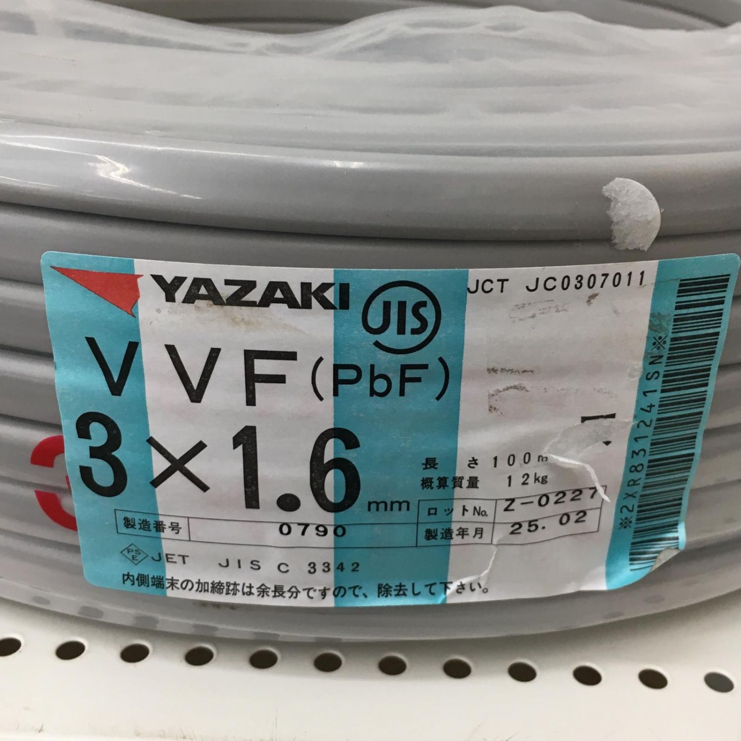 【商品名】中古 YAZAKI 電材 VVFケーブル グレー 3芯1.6㎜×100m 2025年2月 製造 Sランク