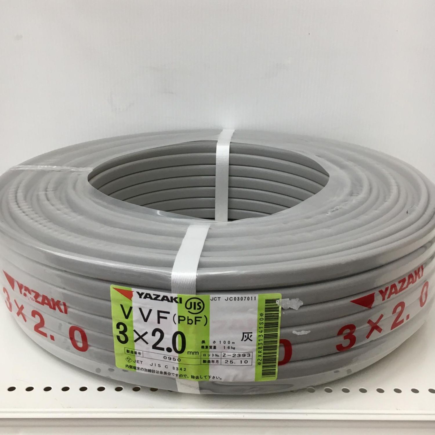 【商品名】中古 YAZAKI 電材 VVFケーブル グレー 3芯2.0㎜×100m 2025年10月 製造 Sランク