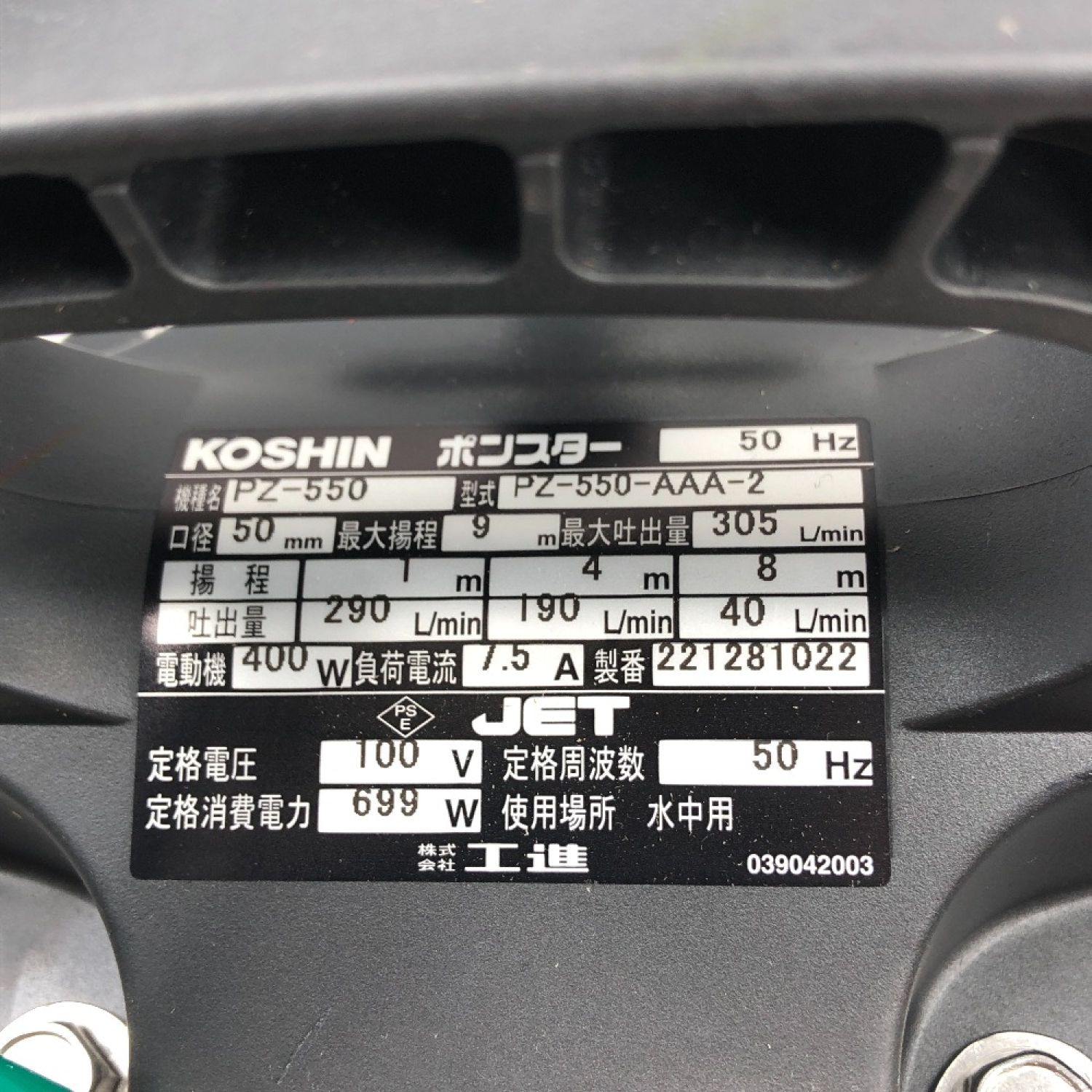 【商品名】中古 KOSHIN 工具 水中ポンプ 未使用品(S) 紐、ホースバンド付 コード式 PZ-550 シルバー Sランク