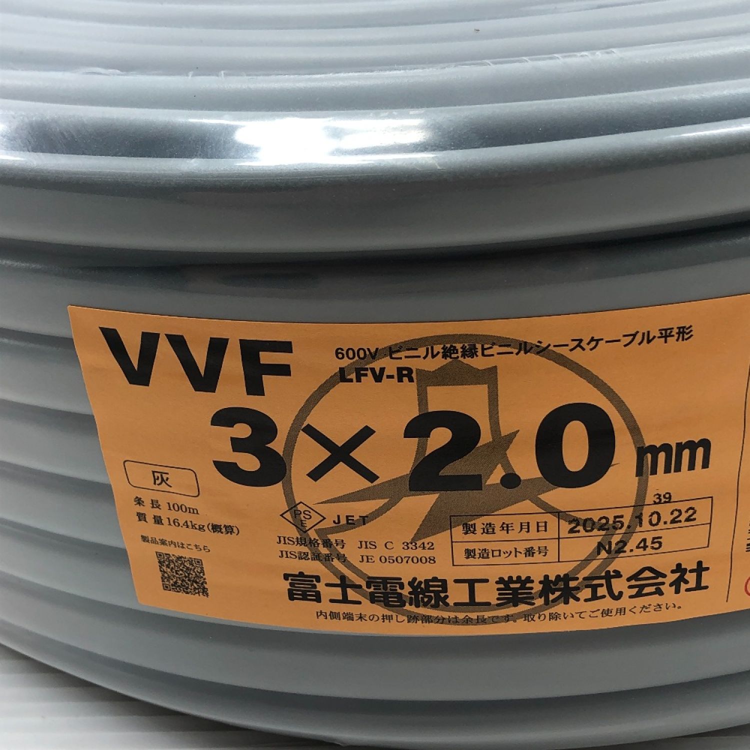 富士電線工業 工具 電材 VVFケーブル 未使用品(S) 3芯 2.0mm×100m 2025年10月(令和7年) グレー
