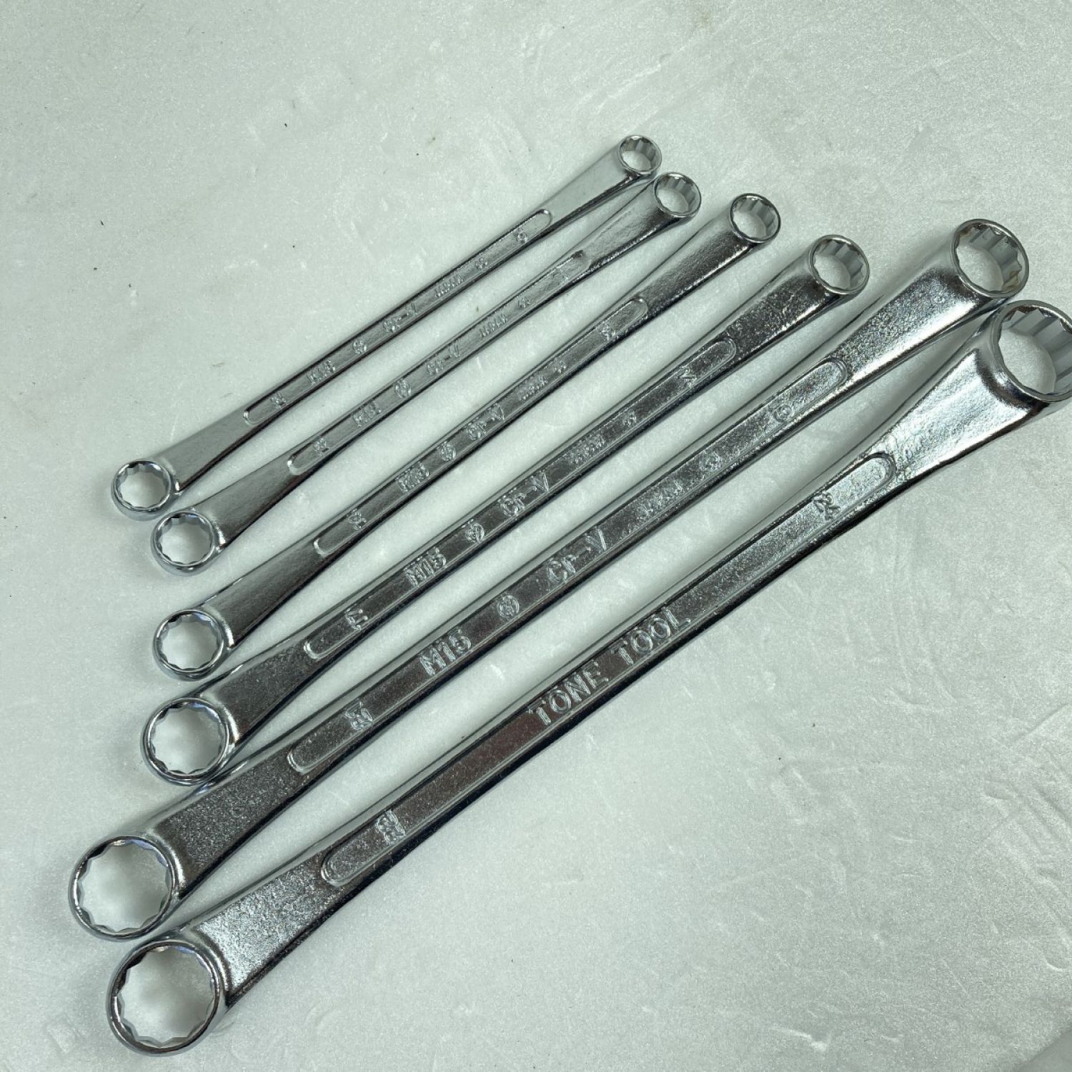 【商品名】中古 TONE トネ 15° ロングメガネレンチセット 6本組 ケース付 M156 シルバー Aランク