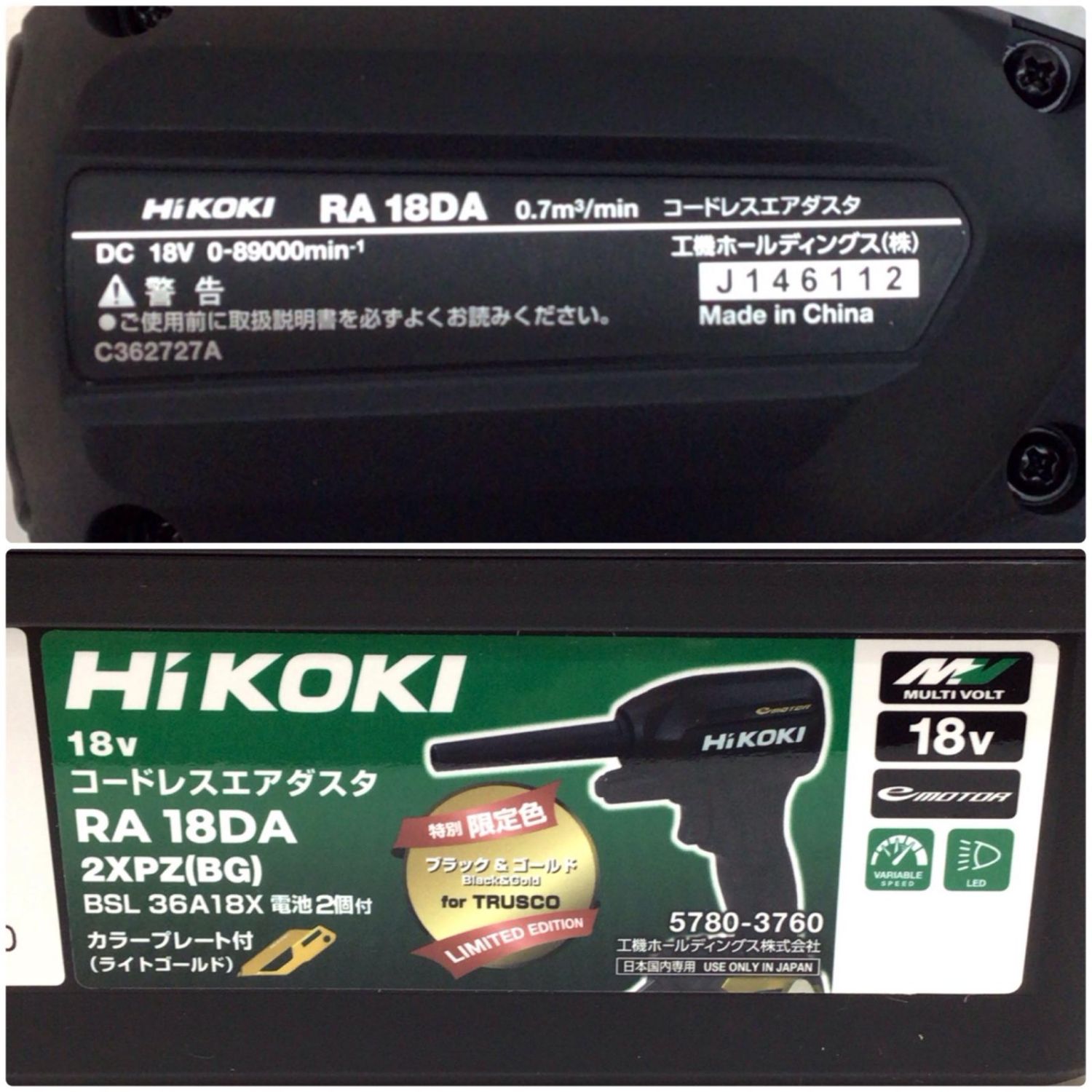 HiKOKI ハイコーキ エアダスタ 未使用品(S) 充電器・充電池2個・ケース付 コードレス式 J146112 特別限定色 RA18DA(2XPZ) ブラック×ゴールド