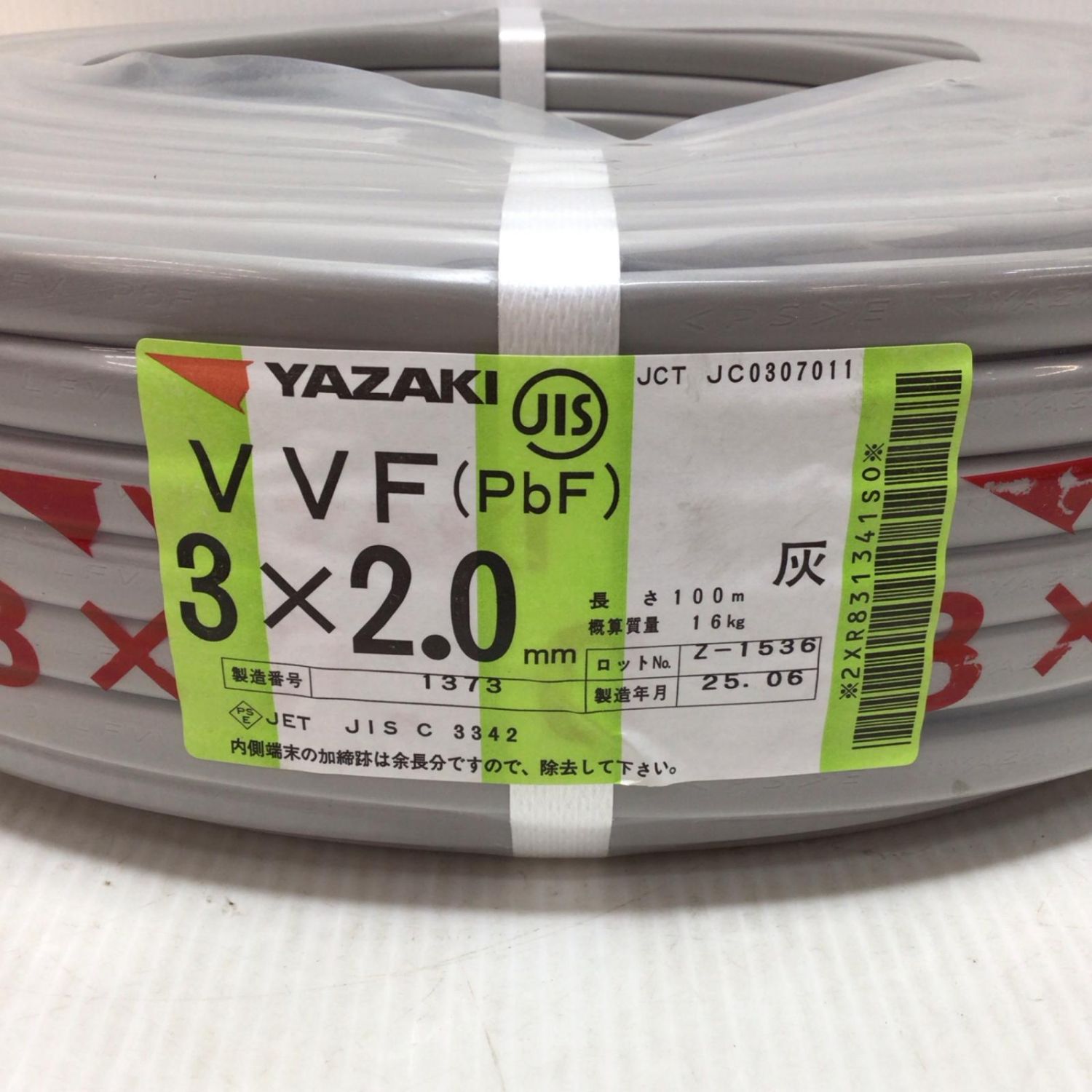 【商品名】中古 YAZAKI VVFケーブル 未使用品(S) 3芯 2.0mm×100m 2025年6月(令和7年) Sランク