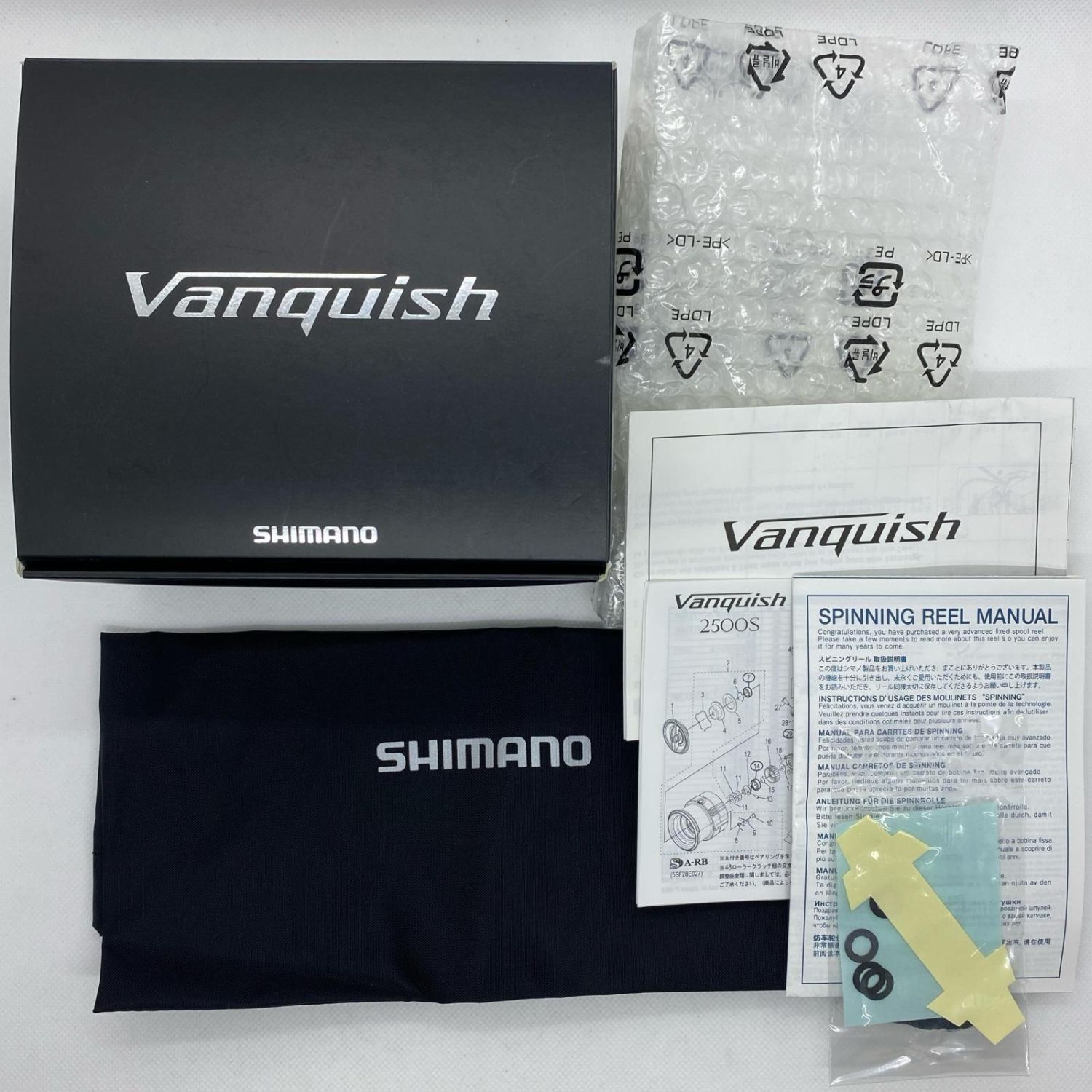 【付属品】取扱説明書,リールポーチ,調整ワッシャー,パーツリスト ・外箱