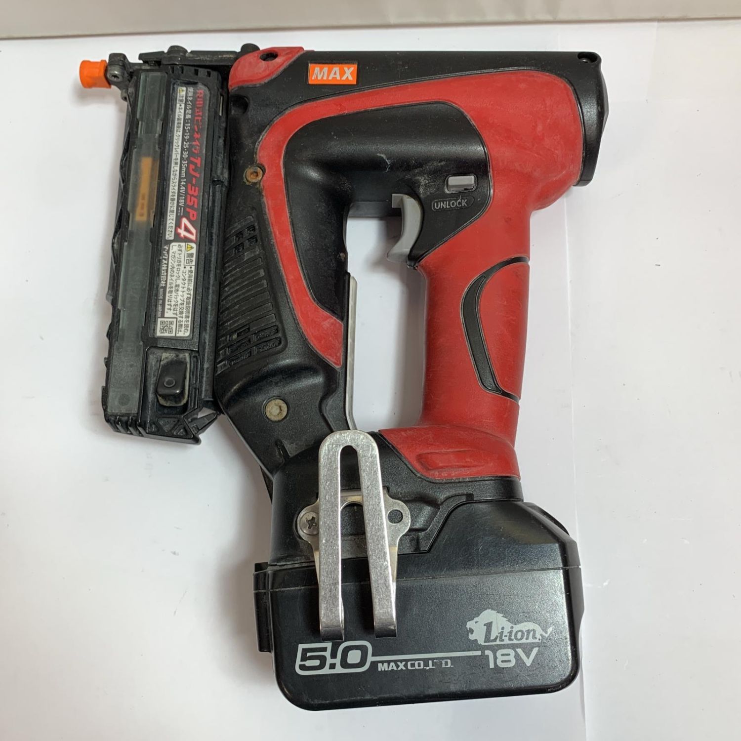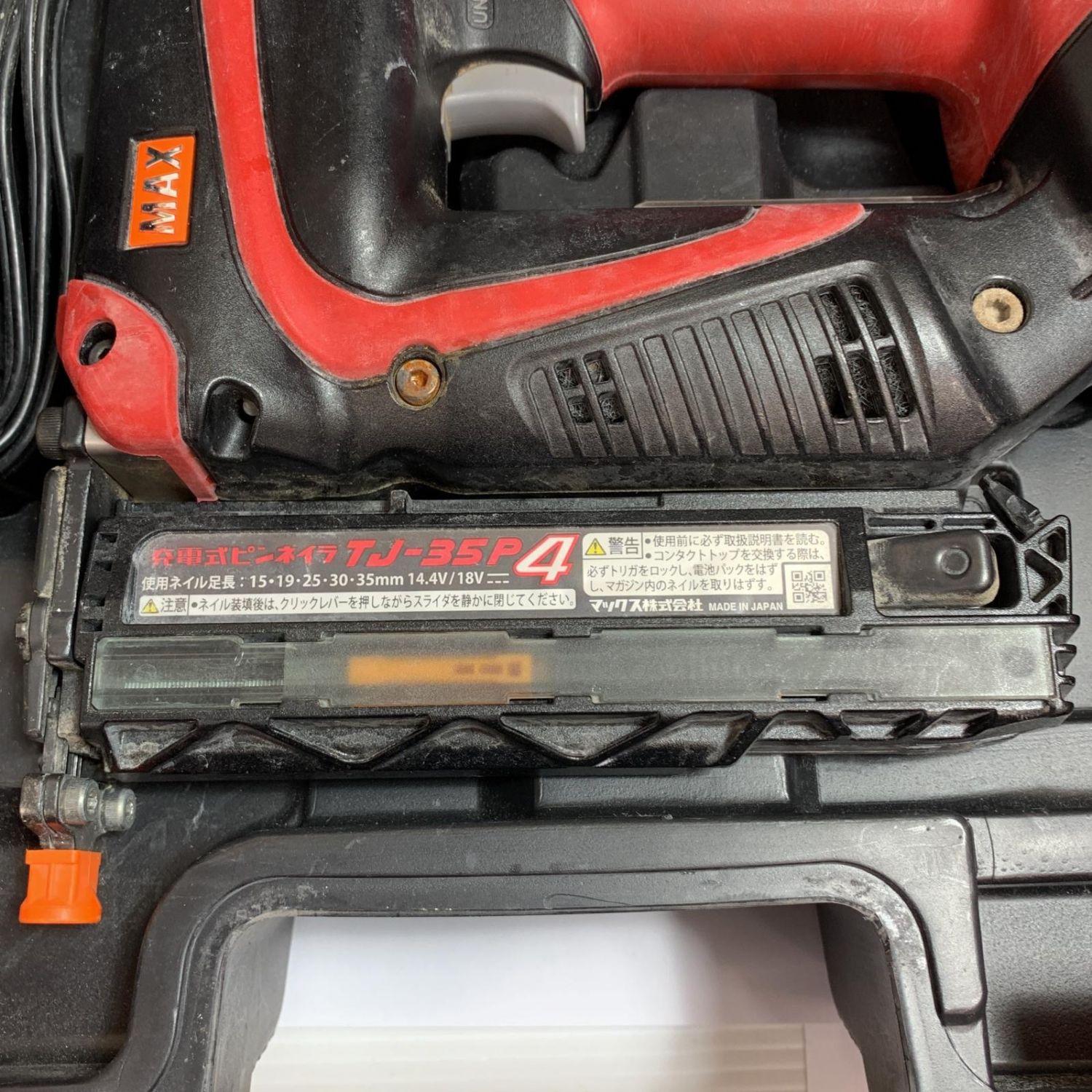 【商品名】中古 MAX マックス 充電式ピンネイラ 充電器・充電池1個・ケース付 コードレス式 14.4v/18v 5.0Ah TJ-35P レッド Bランク