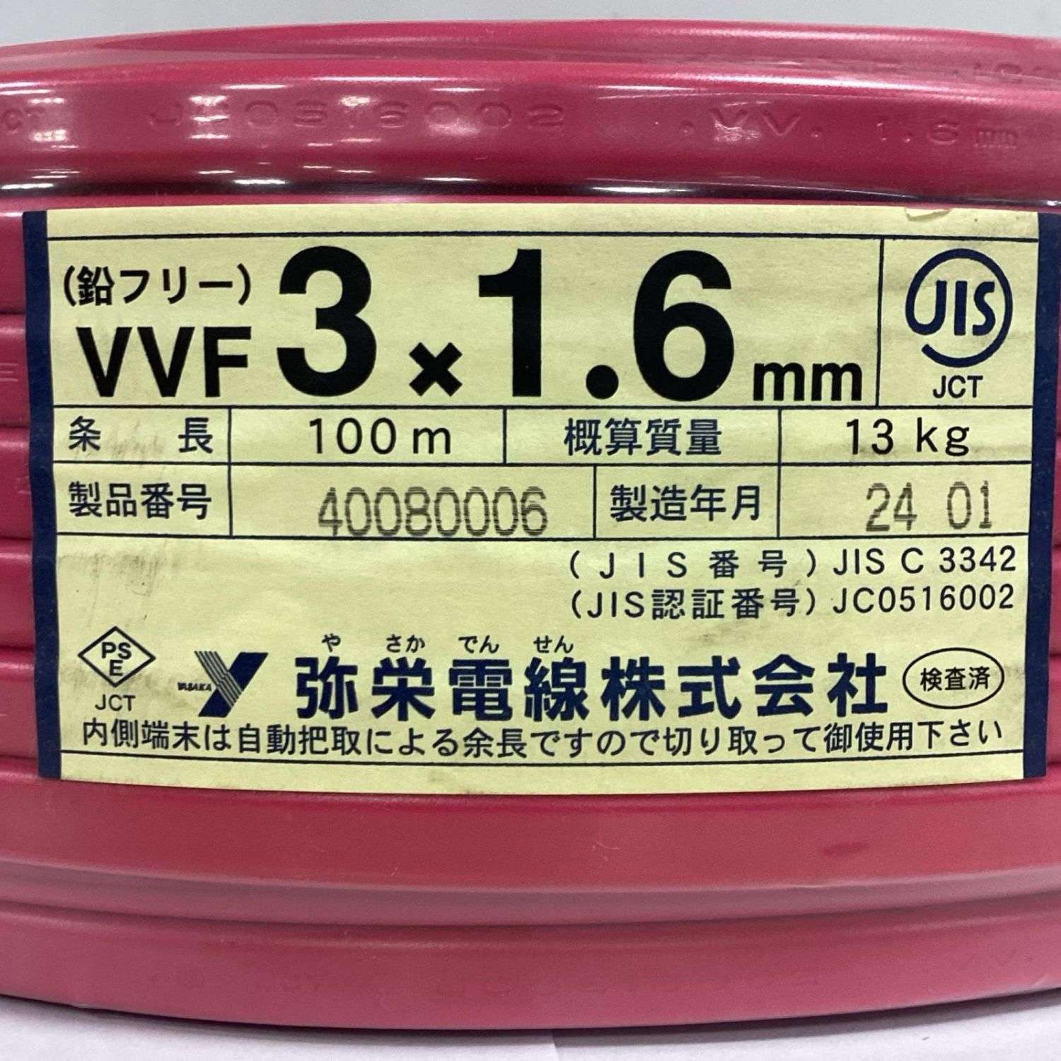 【商品名】中古 弥栄電線 VVFケーブル 3×1.6mm 100m 黒、白、赤 3×1.6 100m レッド Sランク