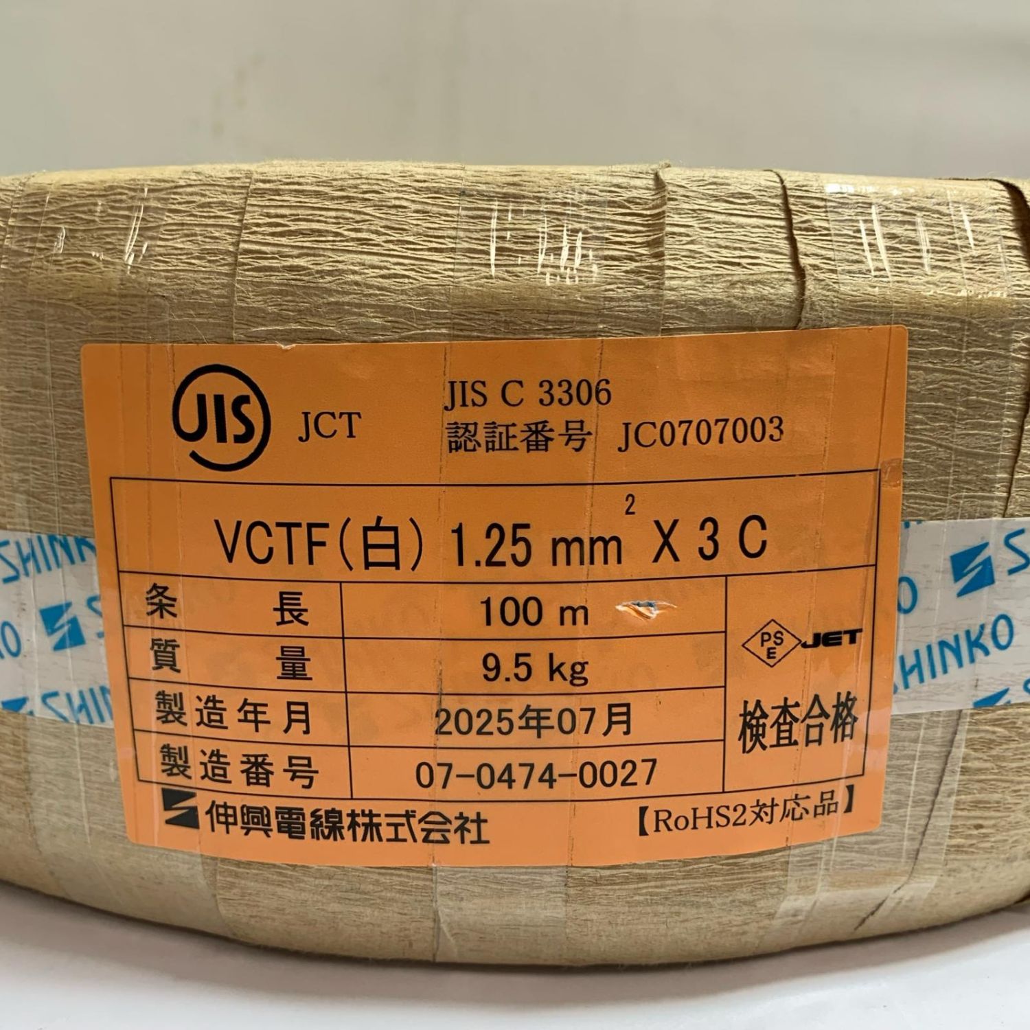【商品名】中古 伸興電線 VCTFケーブル 100m 9.5kg 2025.7製造 1.25×3C Sランク