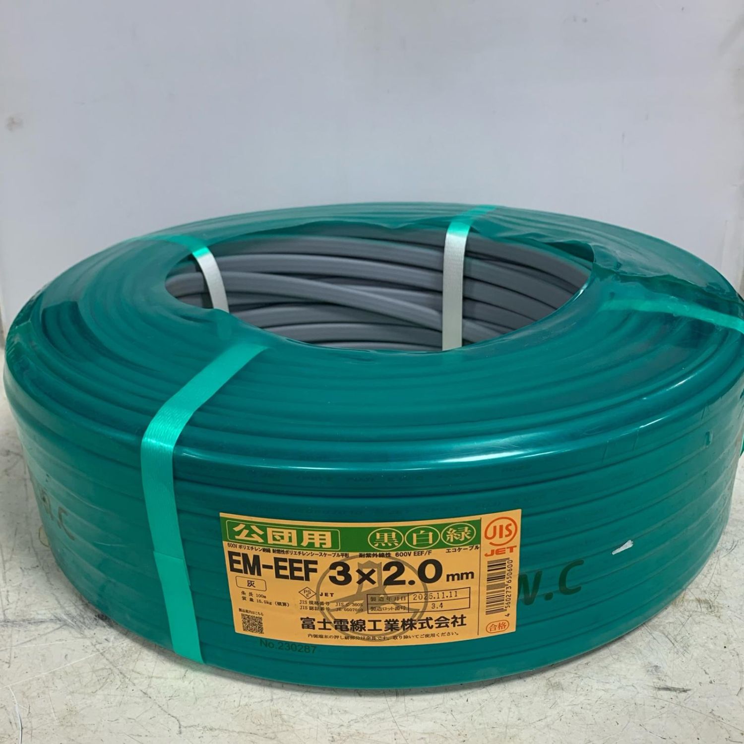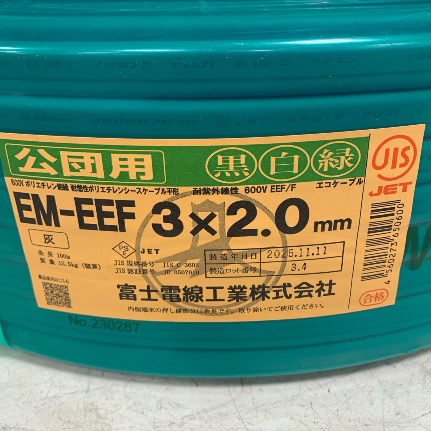 富士電線工業 EM-EEF ケーブル 3×2.0mm 黒白緑 2025.11製造 公団用