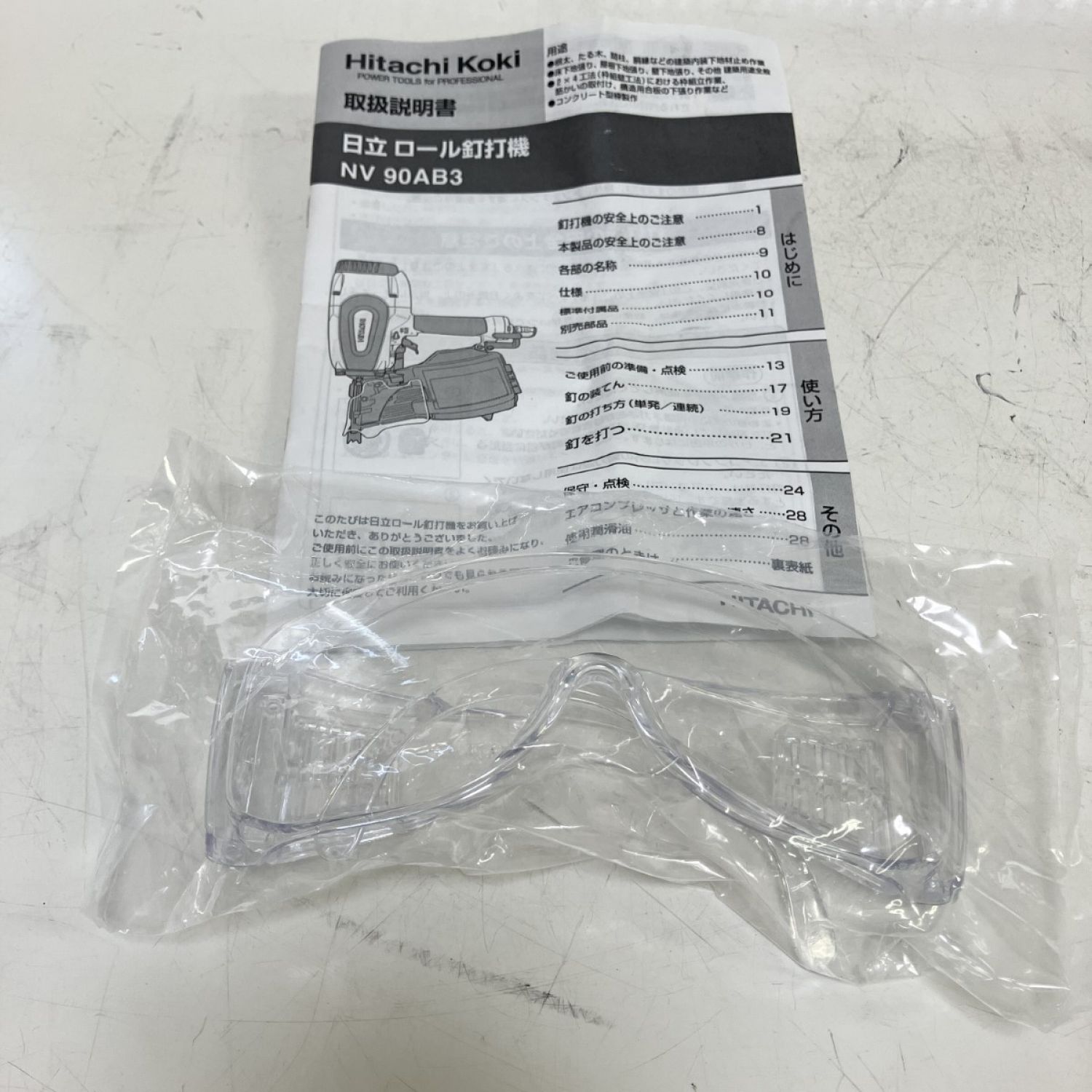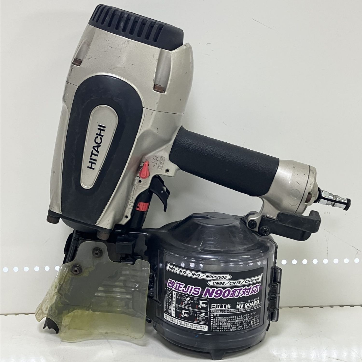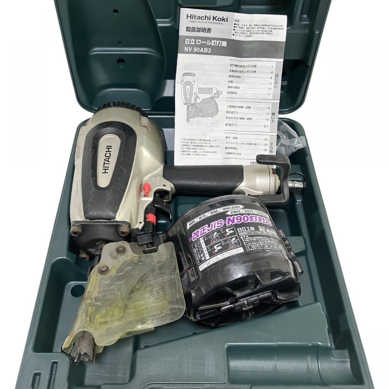 ЗЗ HITACHI 日立 90mm 常圧 ロール釘打ち機 取説 保護メガネ ケース付 NV90AB3 シルバー×ブラック