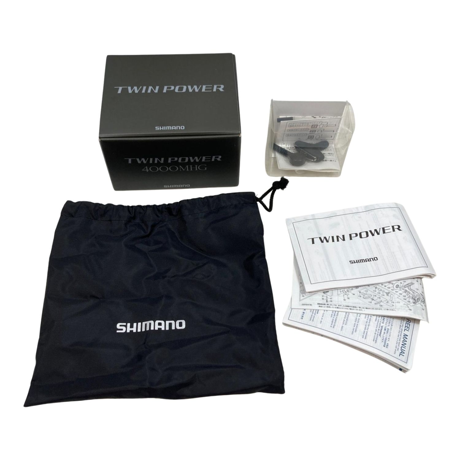 【付属品】取扱説明書,リールポーチ,パーツリスト 外箱・ハンドルノブ