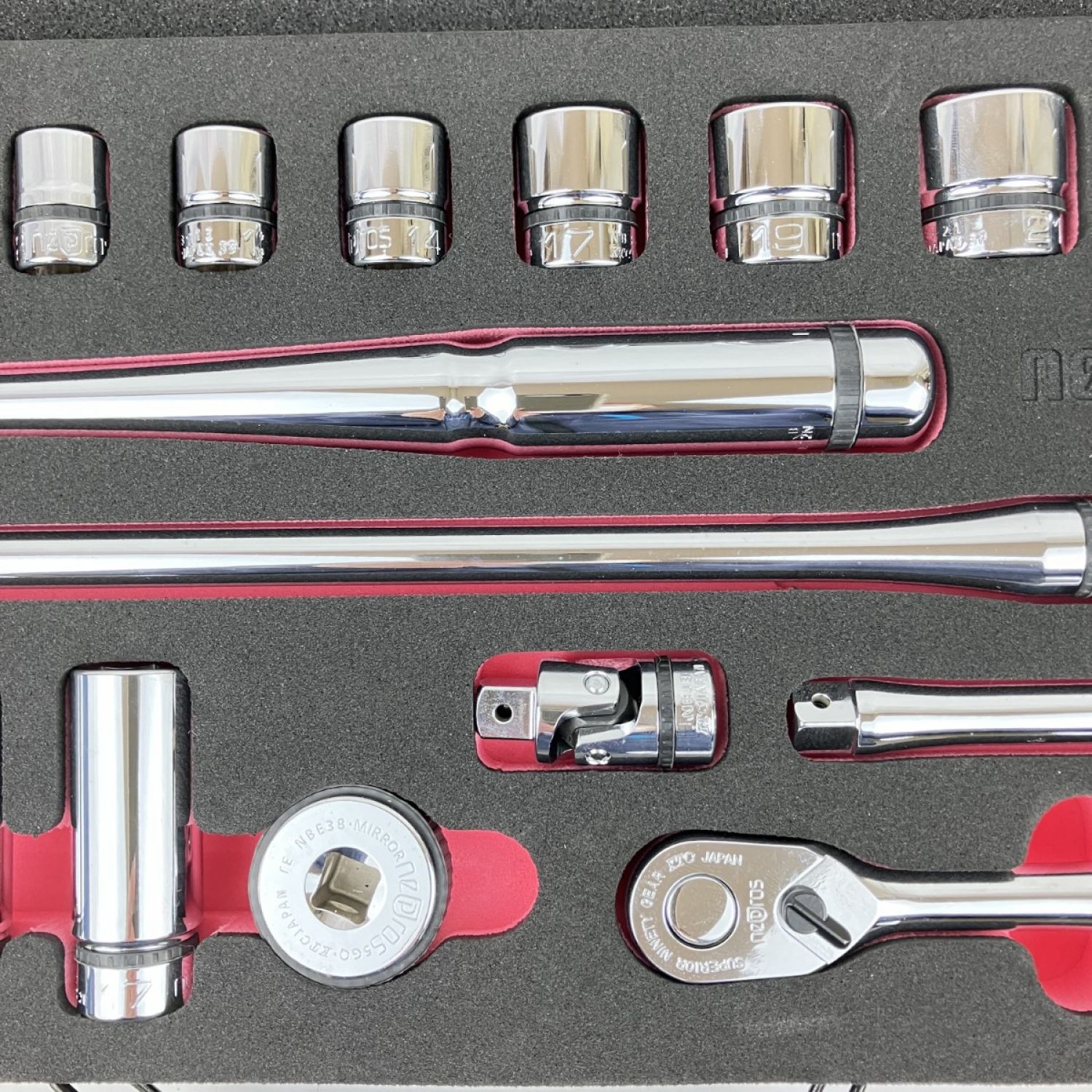 【付属品】純正ケース ソケット六角(NB3-055/07/08/10/12/13/14/17/19/21/22/24)・ディープソケット六角(NB3L-08/10/12/13/14/17)・ラチェットハンドル(NBR390)・スピンナハンドル(NBS3)・クイックスピンナ(NBE38)・エクステンションバー(NBE3-050/075/150/300)・ユニバーサルジョイント(NBJ3)