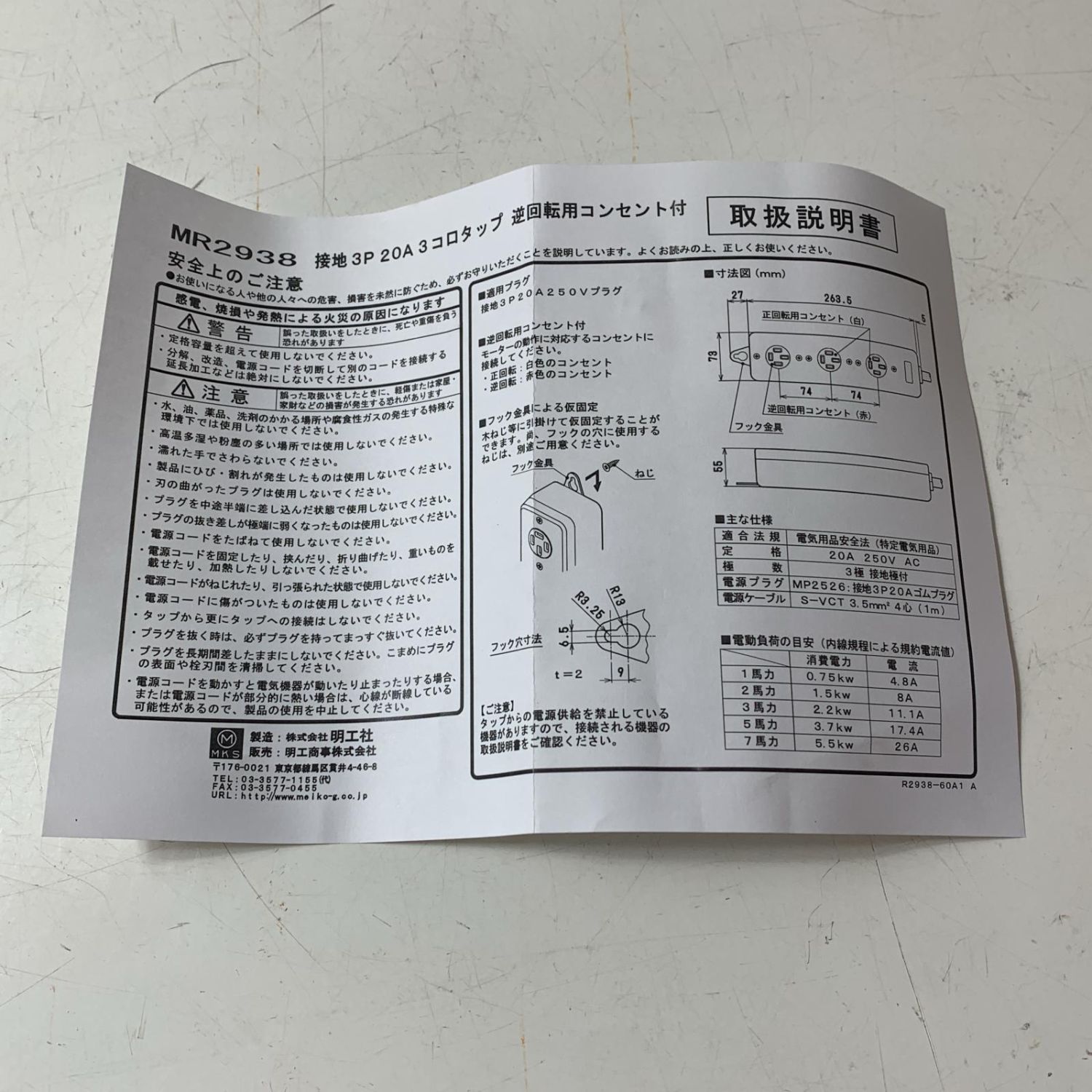 【商品名】中古 明工社 接地3P20A3コロタップ 逆回転用コンセント付 MR2938 Aランク