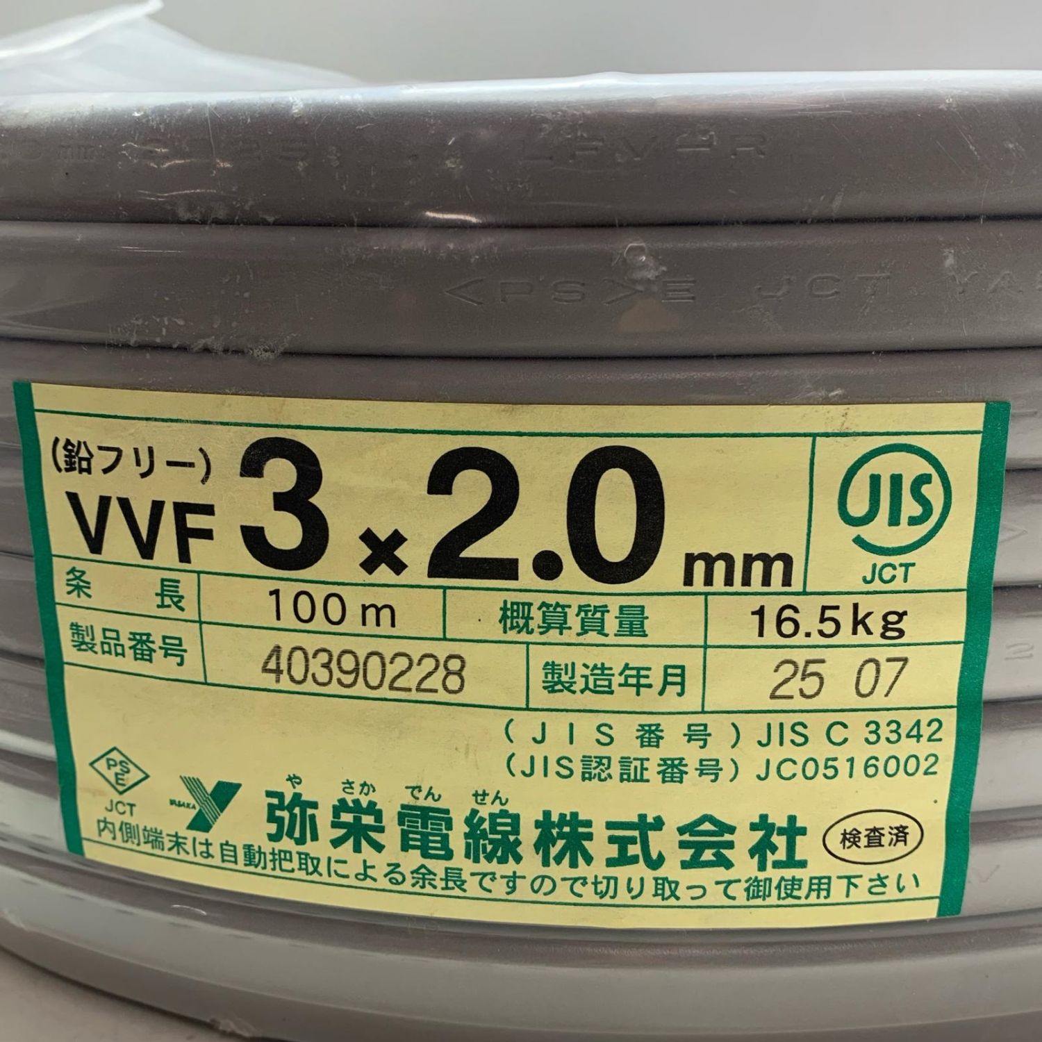 【商品名】中古 弥栄電線 VVFケーブル 3芯 2.0mm×100m Sランク