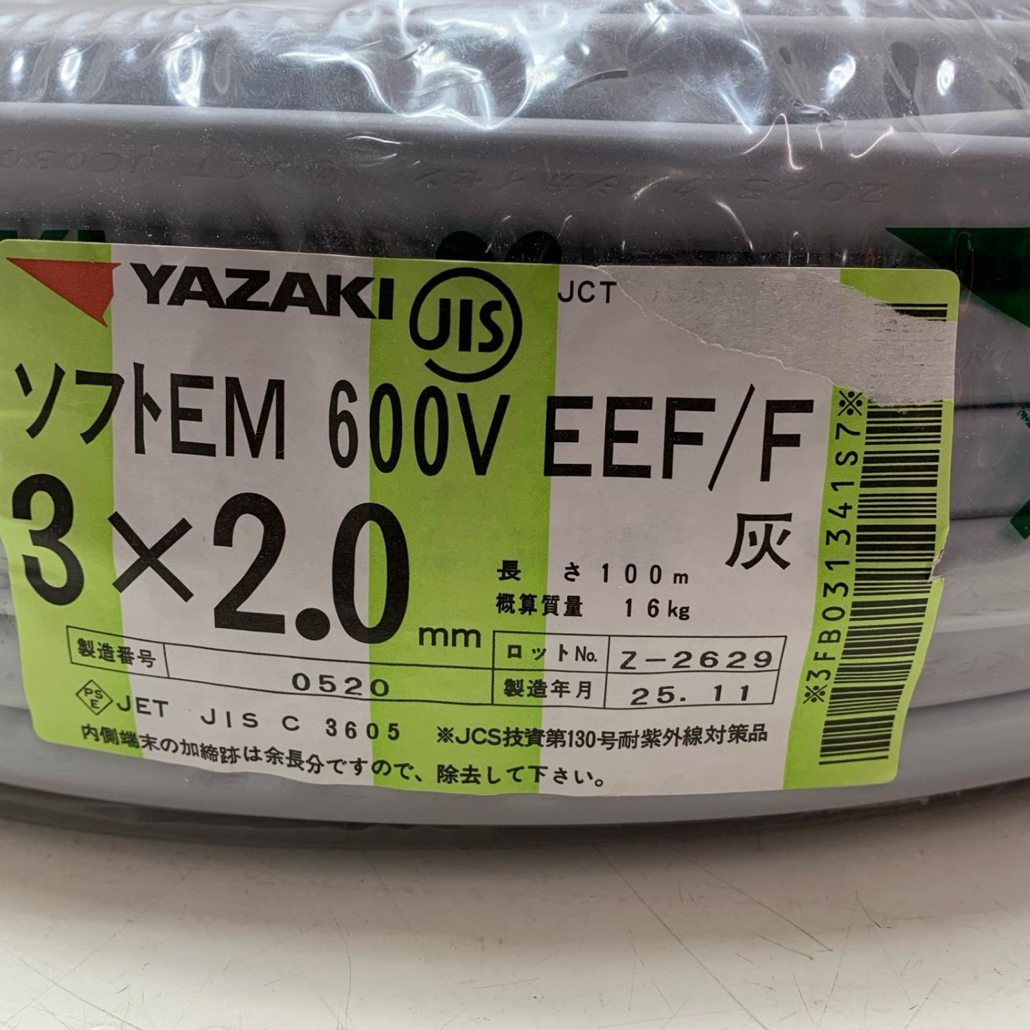 YAZAKI VVFケーブル 3芯 2.0mm×100m 2025年11月(令和7年)