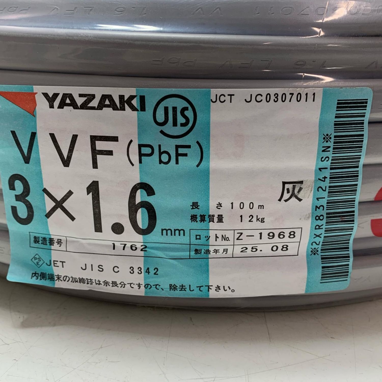 【商品名】中古 YAZAKI VVFケーブル 2025年8月(令和7年) 3*1.6mm Sランク