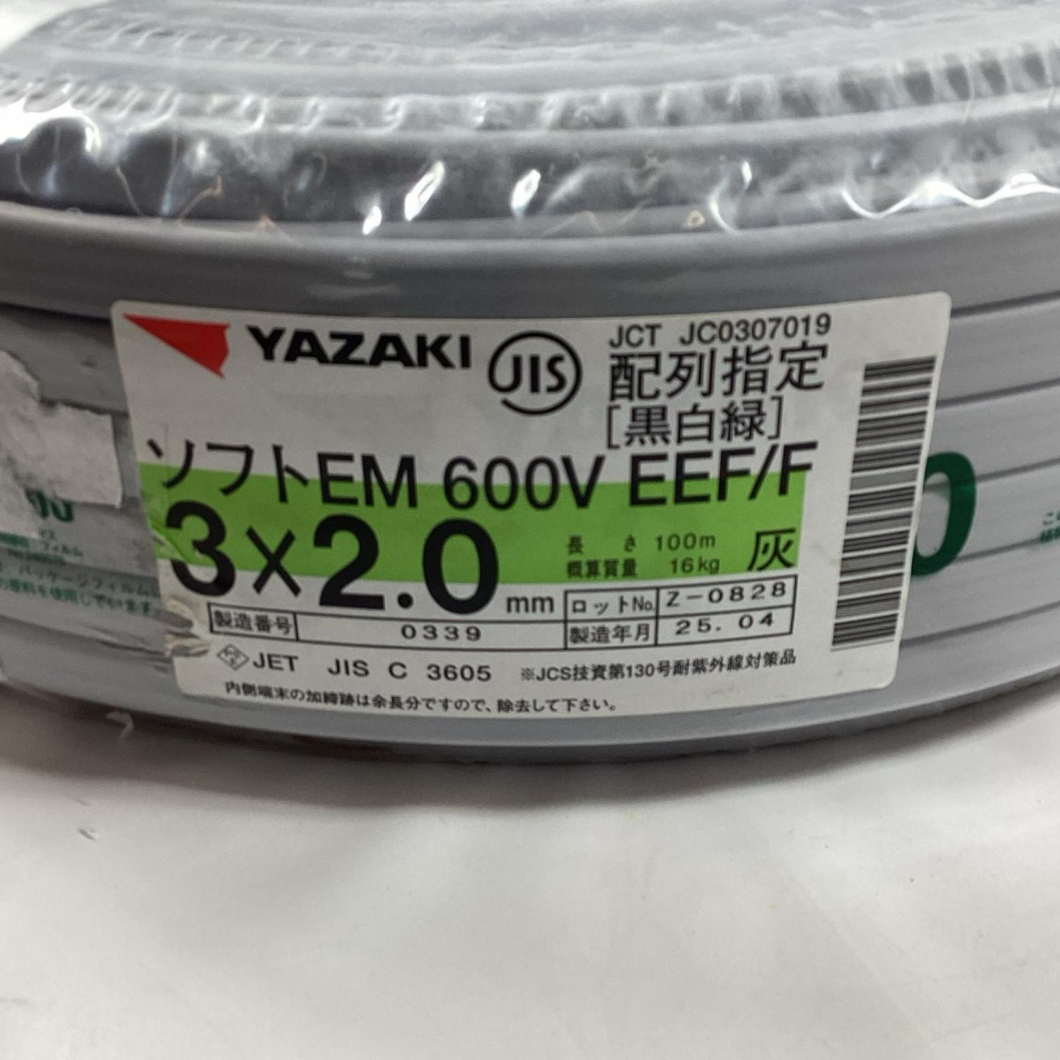 【商品名】中古 YAZAKI VVFケーブル 3芯 2.0mm×100m 2025年4月製造 Sランク